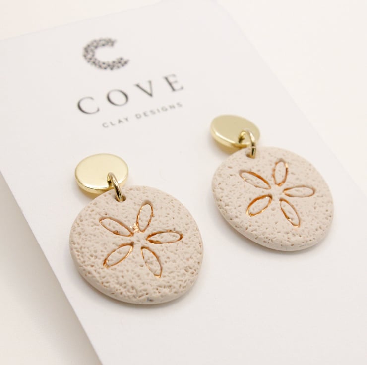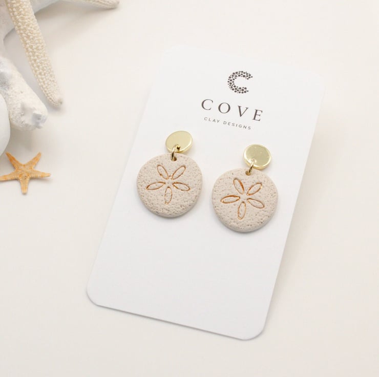 Handmade sand coloured sand dollar clay earrings with embossed gold detailing and gold earring posts.