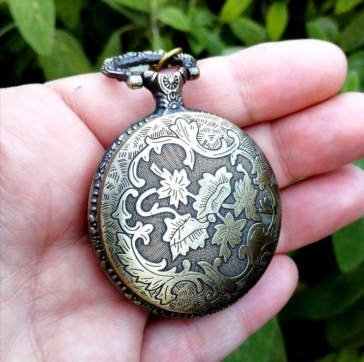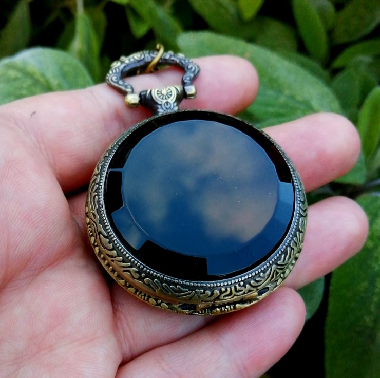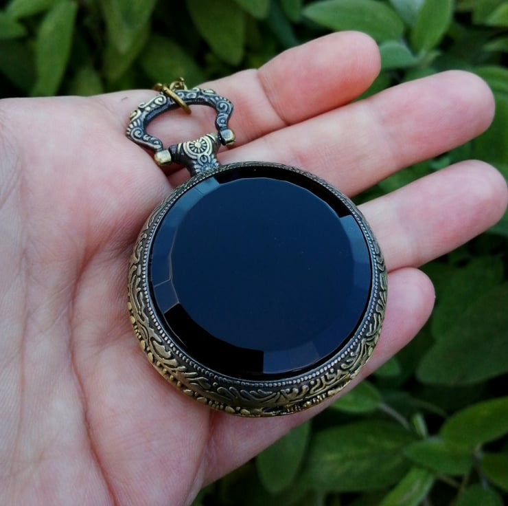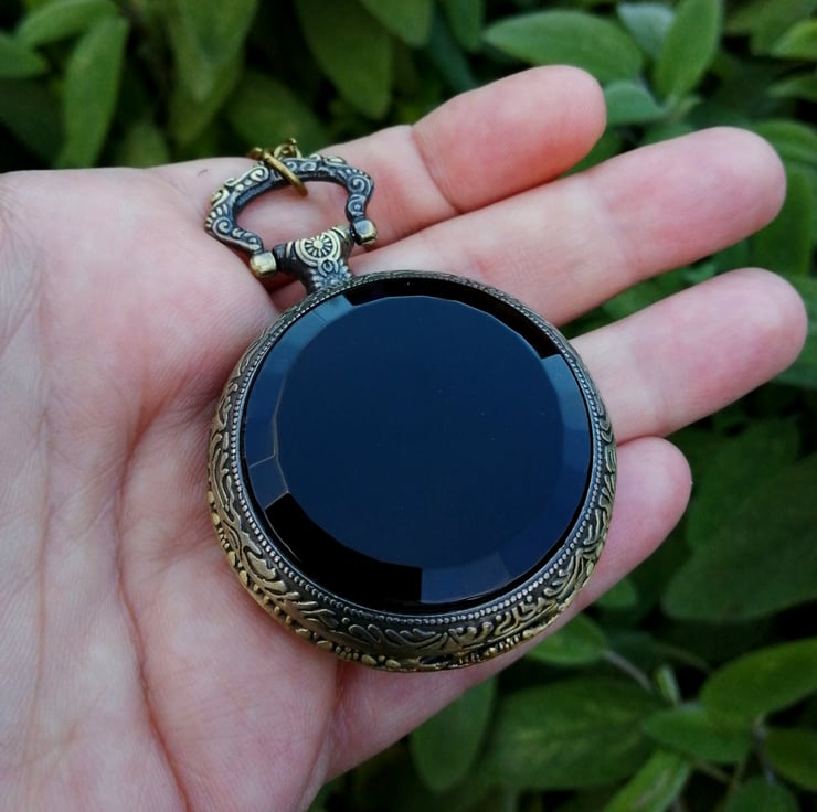 A black acrylic faced, bevelled scrying mirror made in an etched Metal case which comes on a necklace chain.