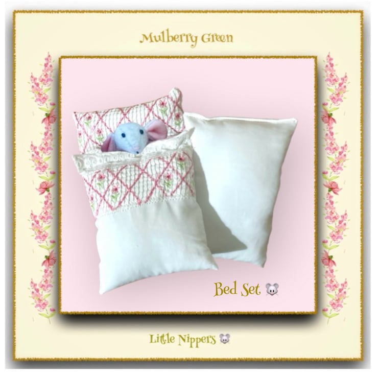 A cute little bed set that fits perfectly into the mouse boxes to make an adorable little bed for your mouse. The set consists of a mattress, an embroidered cotton duvet trimmed with broderie anglais and a matching embroidered pillow. Perfect for your little mouse to take a nap.