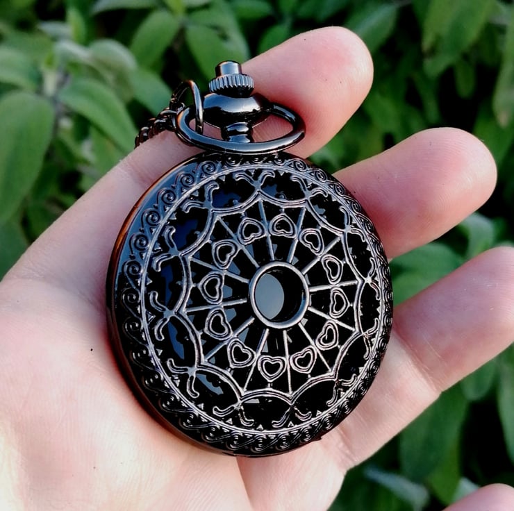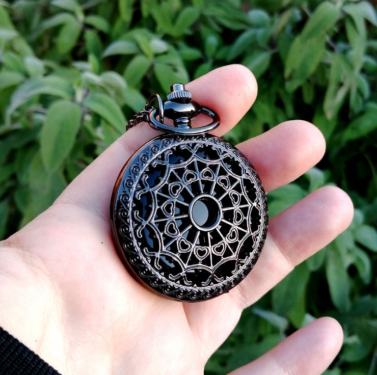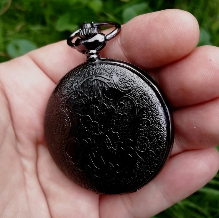 A black acrylic faced scrying mirror made in an etched Metal case which comes on a necklace chain.