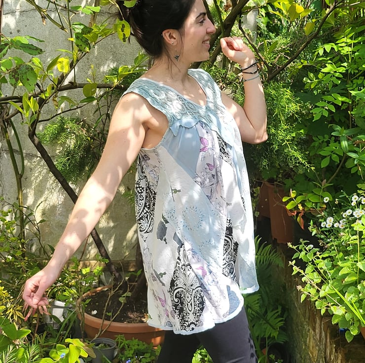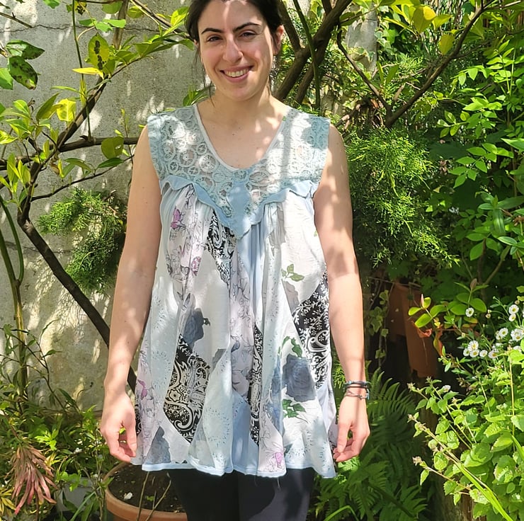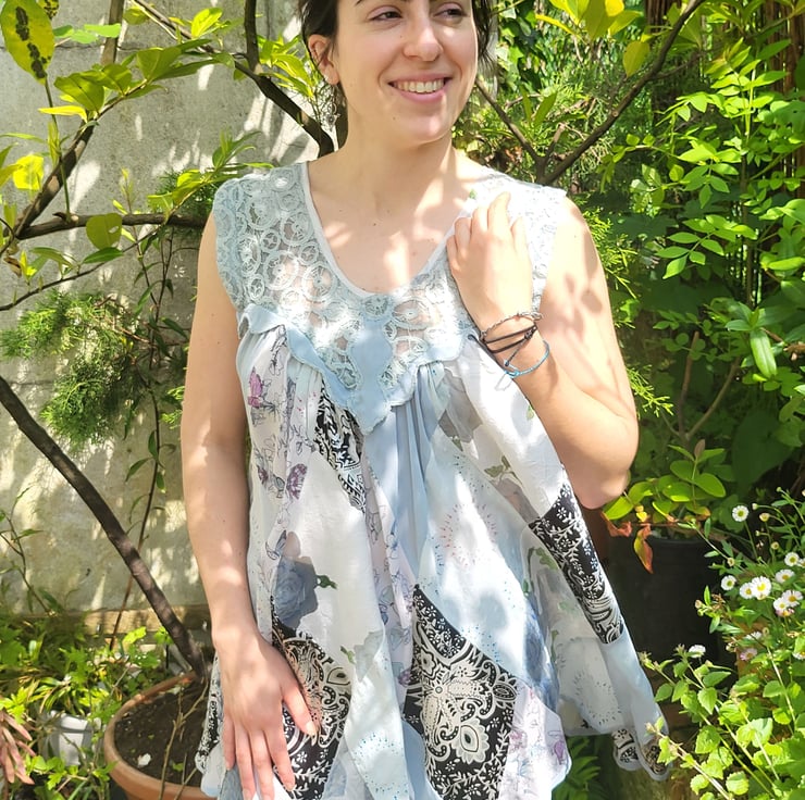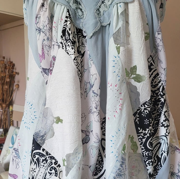 Pretty 'floaty' loose fit sundress in diamond patchworks gathered from lace yoke. Colours, white, pale blue, pale jade (like abalone shells) and black highlights. Wear as long top or short mini dress. Fits below hips.