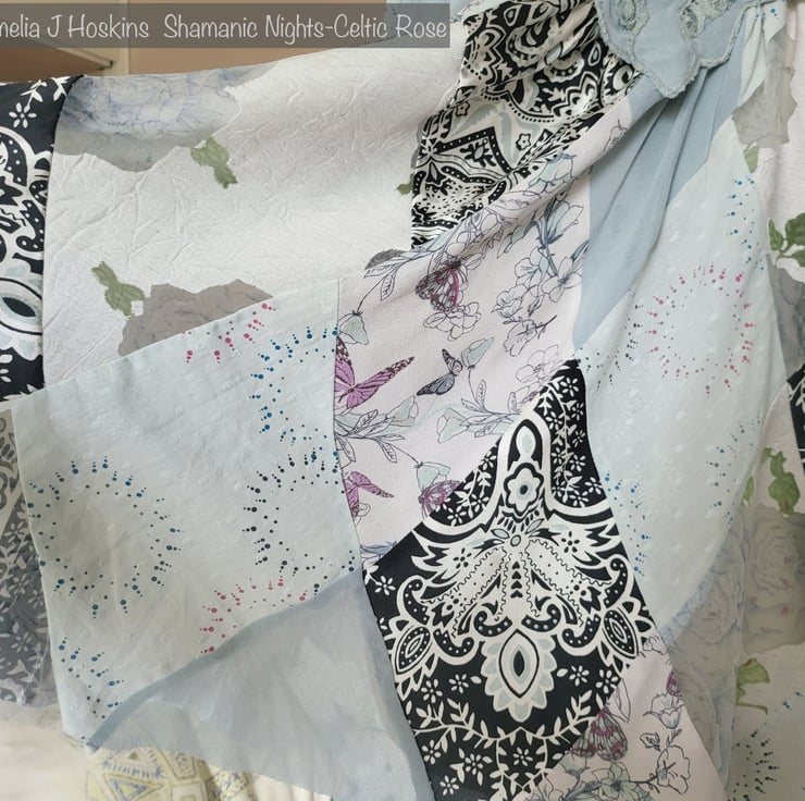 Inspiration was the cotton lace blouse to use as yoke front and back: also pale blue rose devore fabric, matched up with pale blue and pale green fabrics.