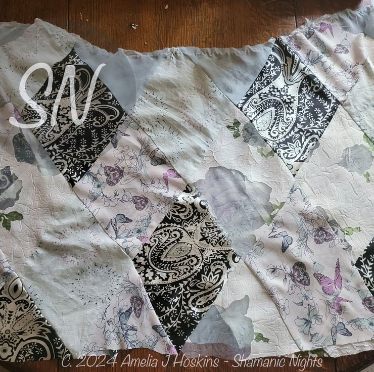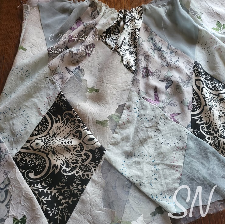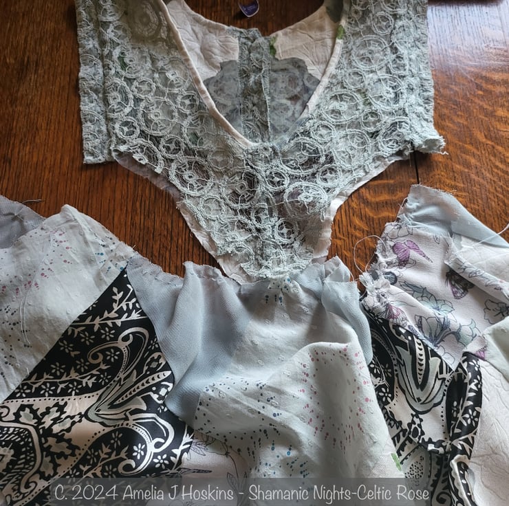 I've been wanting to do a diamonds patched dress so the idea of using the lace blouse cut to a V yoke to gather patches from was inspiring.