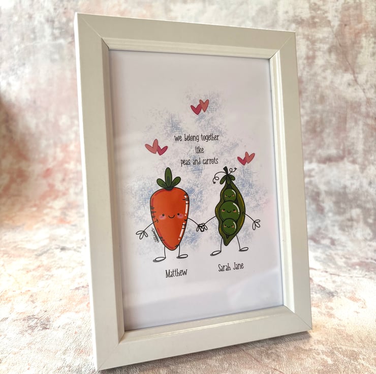 This custom art print features an adorable kawaii theme of Carrots and Peas, perfect for showcasing your love for that special someone or a close friend. A thoughtful and unique gift choice for birthdays, Christmas, or anniversaries. Share the cuteness with this personalised art print.