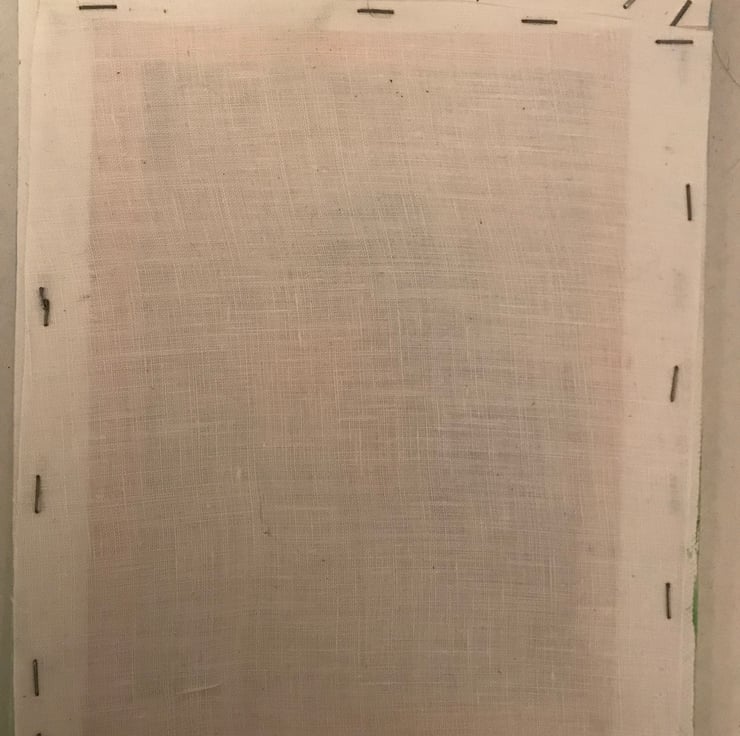 On a 10 x 8 inch stretched canvas, backed with white linen. Hanging bar.