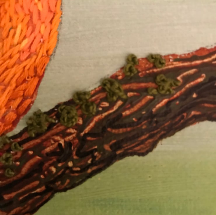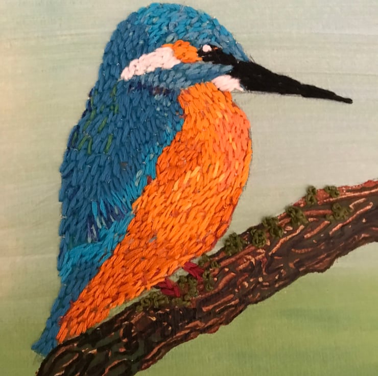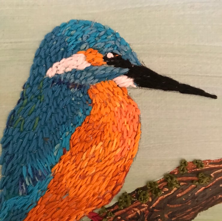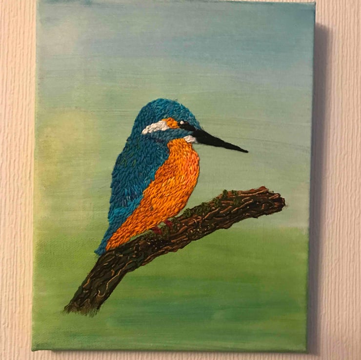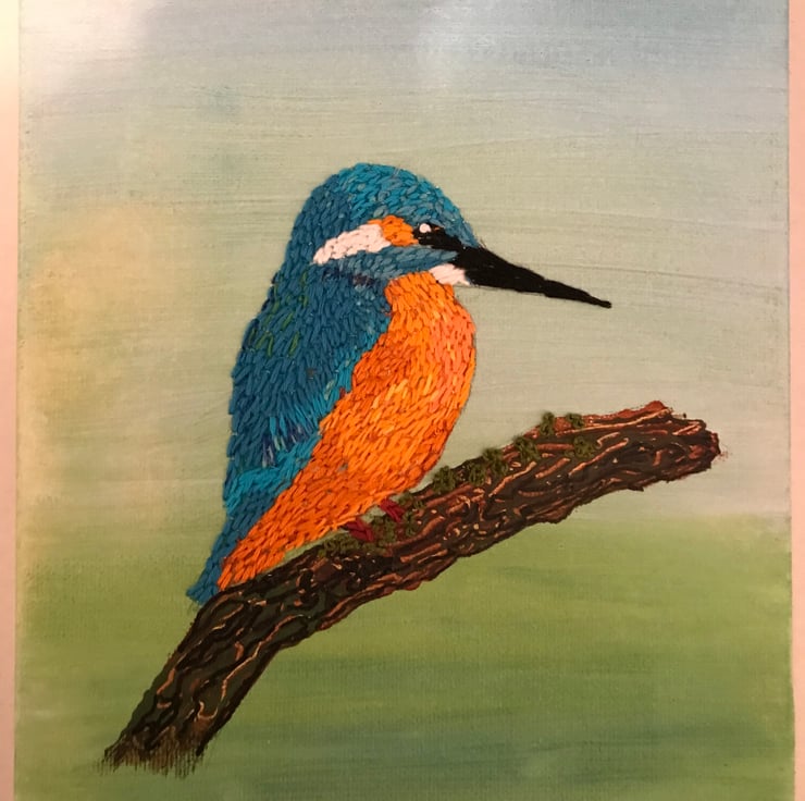 Painted canvas with hand embroidered kingfisher sitting on a branch.