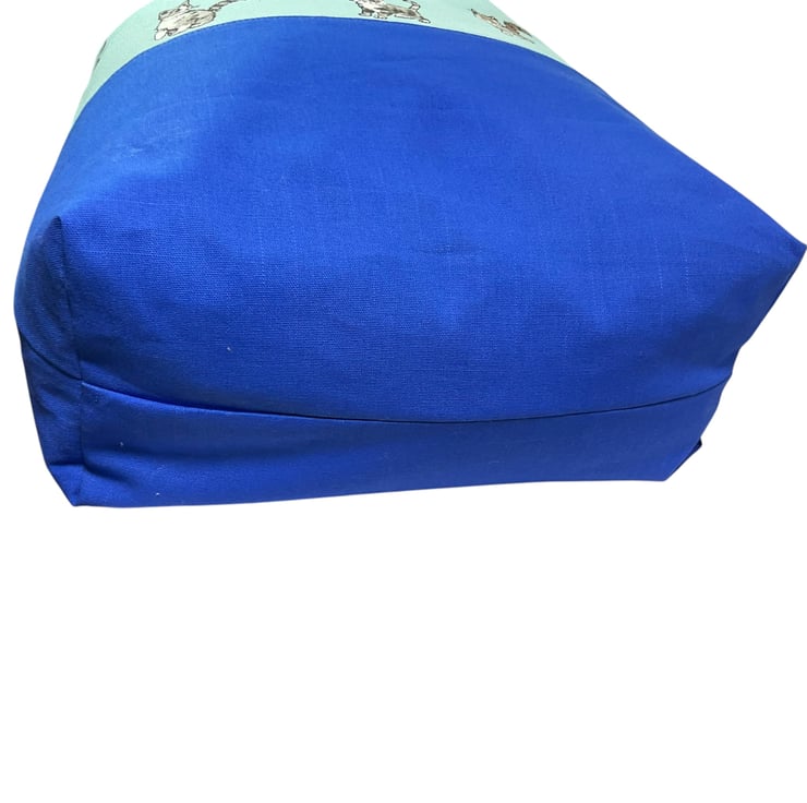 The main fabric is a cute natural shades, patterned cat print on a turquoise blue base ( pattern placement may vary) and I have paired it with a heavyweight royal blue canvas cotton.
