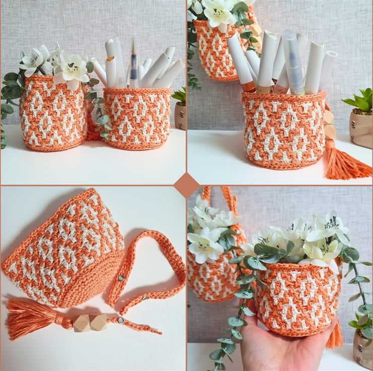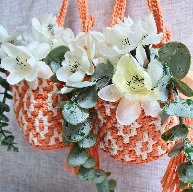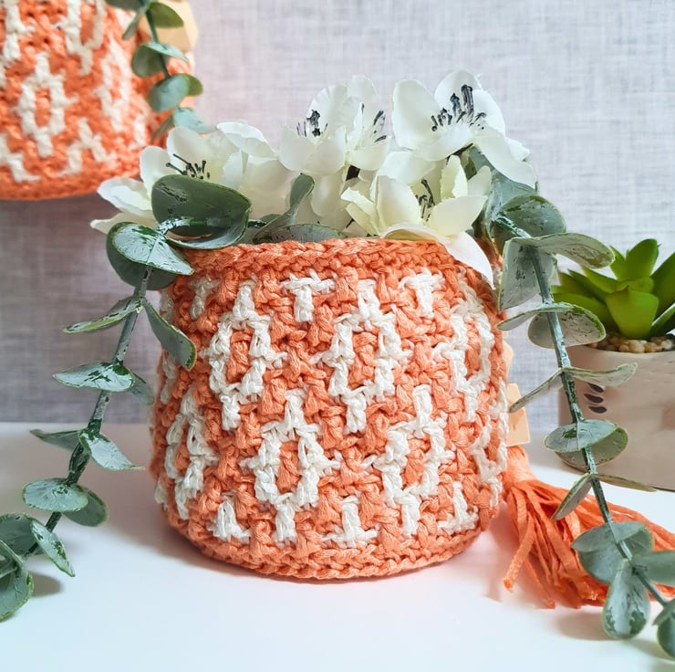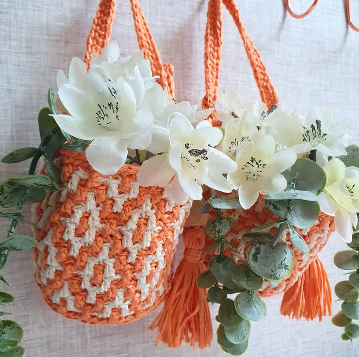 Set of two hanging baskets in coral & white, handmade with the mosaic crochet technique. Perfect for hanging on your wall and fill with artificial flowers, air plants & small flower pots, on your peg board filled with your craft tools and various bits & bobs, or just place them on your furniture & decorative shelf & use them to store all your small items. A practical & modern idea for your interior decor, or as a housewarming gift.