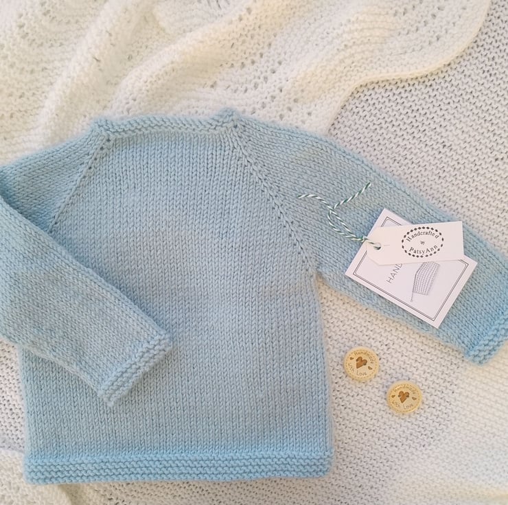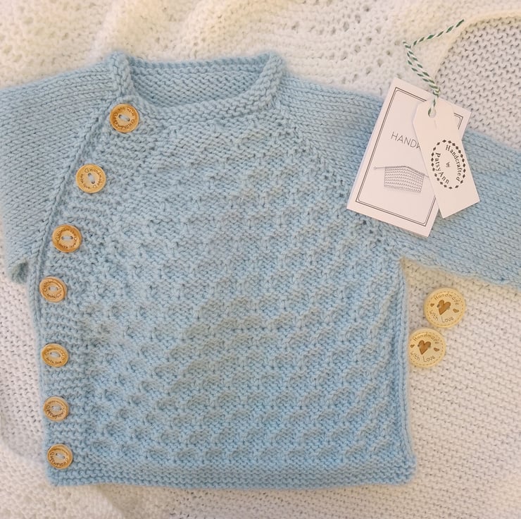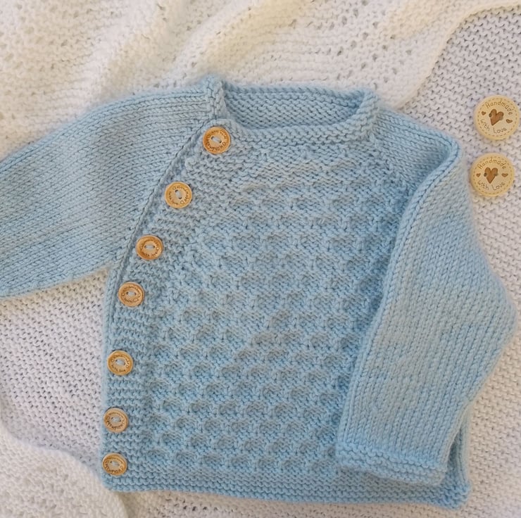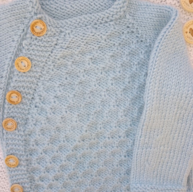 Baby cardigan Hand Knitted in Premium Acrylic Yarn and finished with Wooden Buttons The garment is a 0-3 month size approx , has a side button opening and the front panel is knitted in a honeycomb stitch