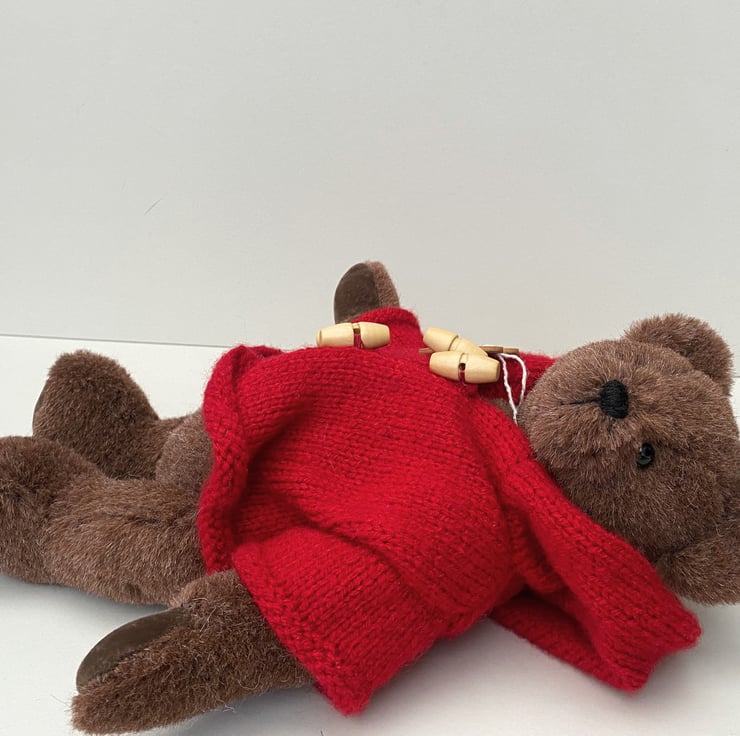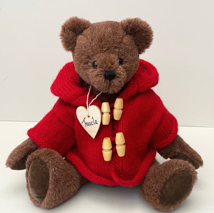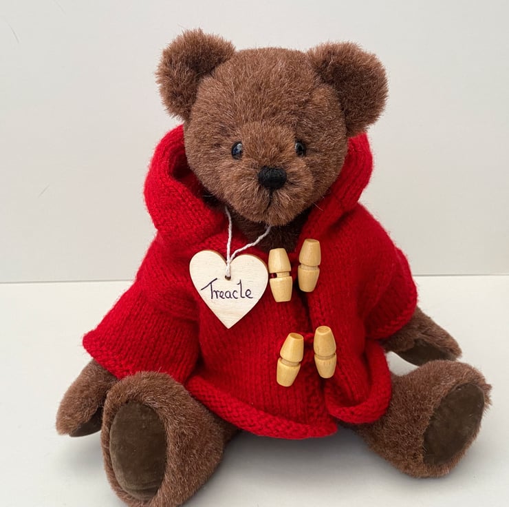 Treacle wears a lovely brick red duffle coat, hand knitted in Wendy yarn and finished with 4 natural wood toggles and oversized hood.