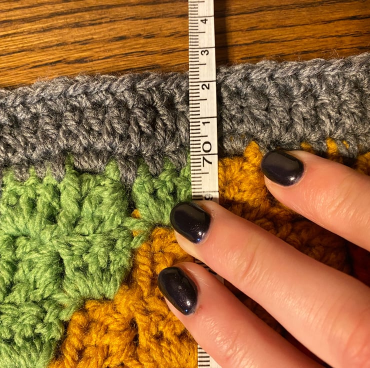 The blanket measures approximately 72.5cm square. The blanket is crafted in Yarnsmiths Create Aran 100% acrylic yarn in colours dark heather, plum, royal blue, cornflower blue, grass green, antique gold, burnt orange and scarlet red.