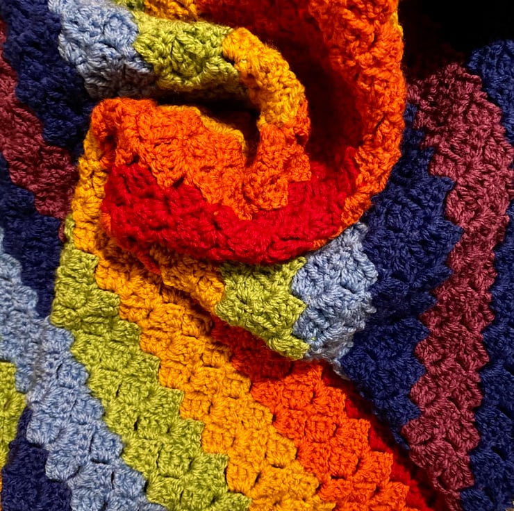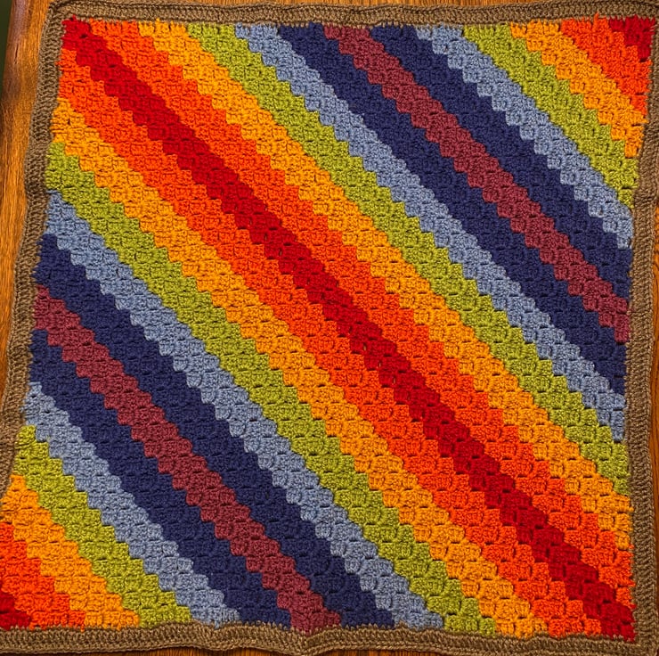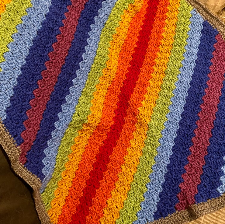 Handcrafted crochet blanket in a square corner-to-corner design which gives a lovely textured effect. This one is suitable as a baby blanket (this size / shape works well for cots and push chairs), or as a lap or throw blanket. Colourful rainbow stripe pattern, edges with contrasting dark grey to help those colours pop!