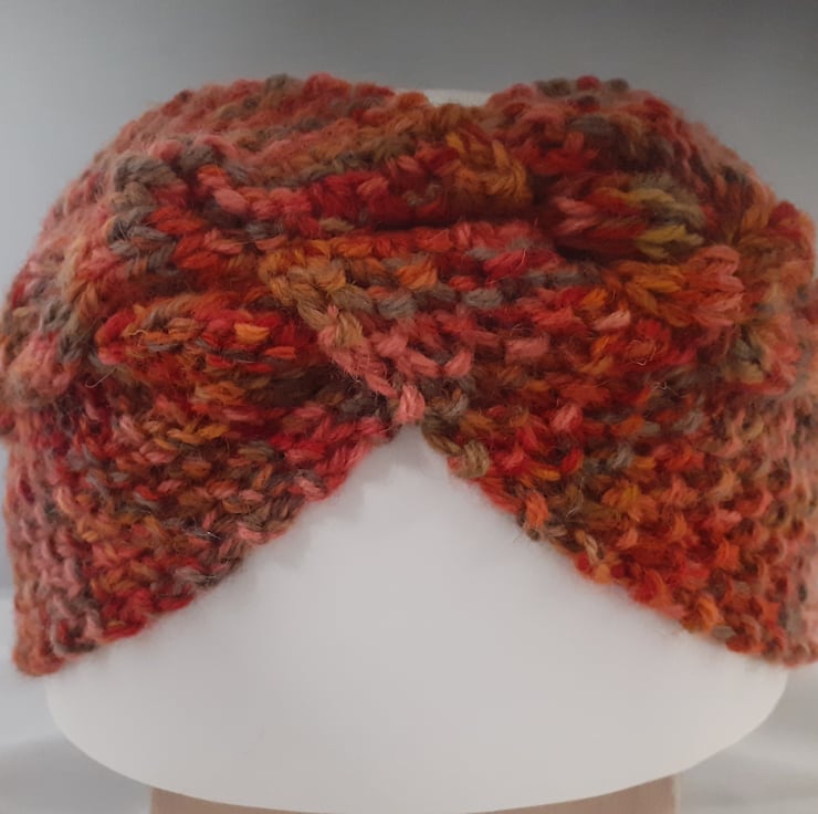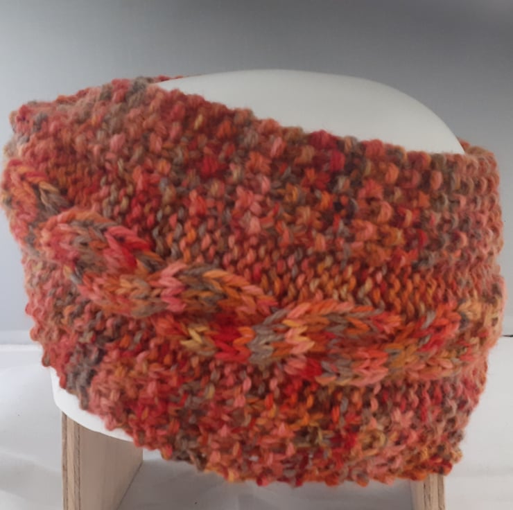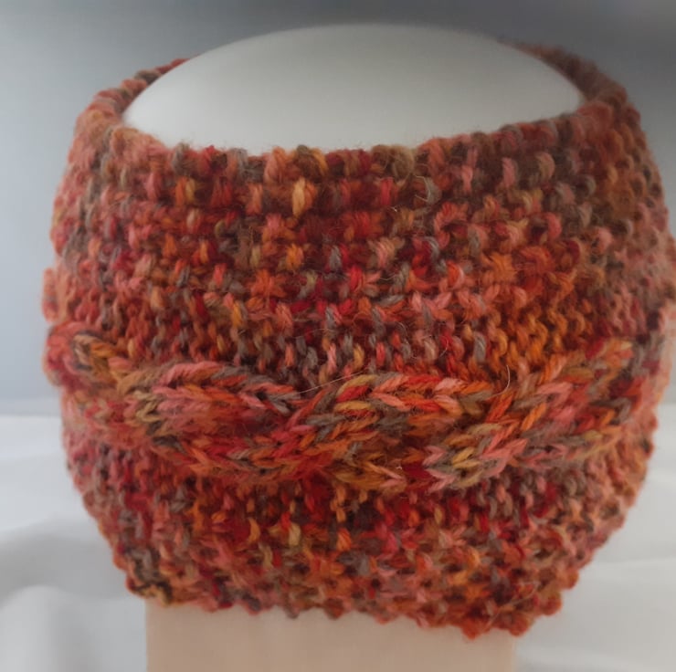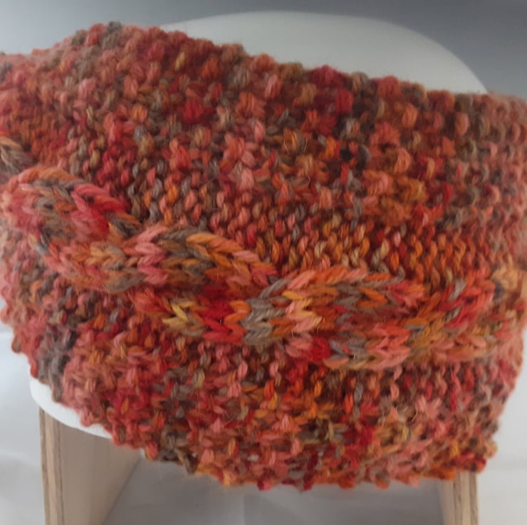 This super Shetland wool head band/ear warmer will keep you warm in the coldest weather. It's been grown , hand dyed and knitted on our farm, and has shades of pink, greens, and yellows in it. It's a nice and deep band, approximately 12cm and its circumference is approx 53cms, but stretches to fit.