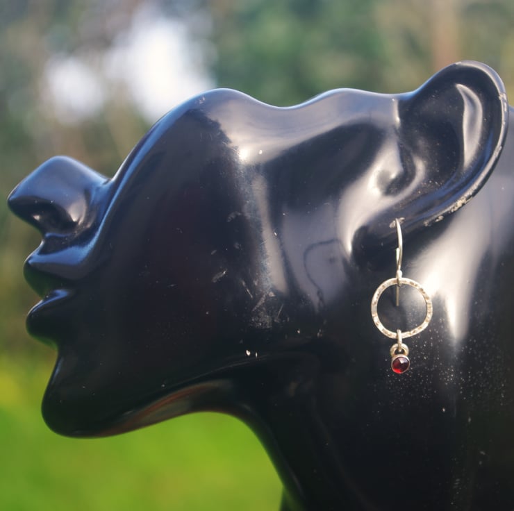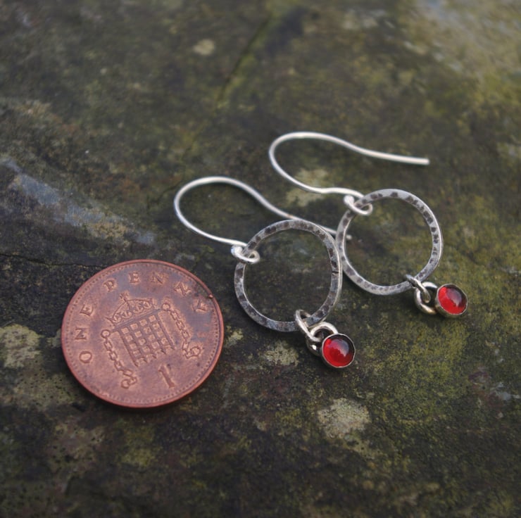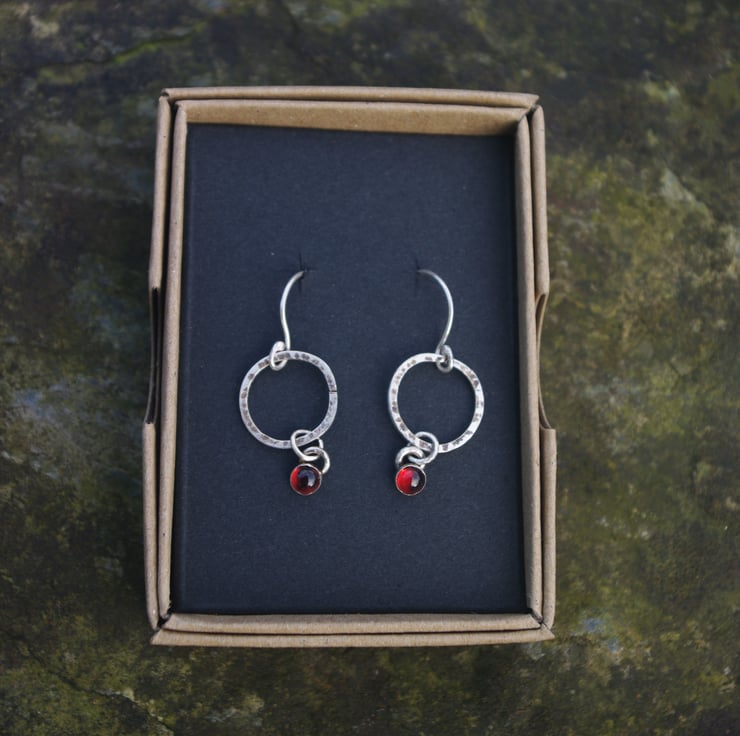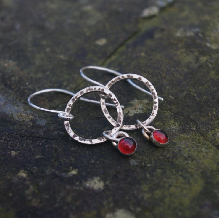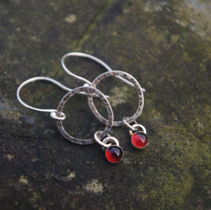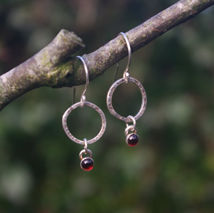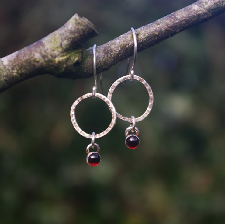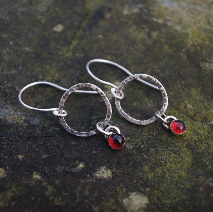 Sterling silver roughly circular earrings inspired by natural textures. They are made with square wire, textured with a small hammer. Deep red garnet cabochons with a diameter of 4mm, hand set in silver, dangle from the bottom, moving about freely.