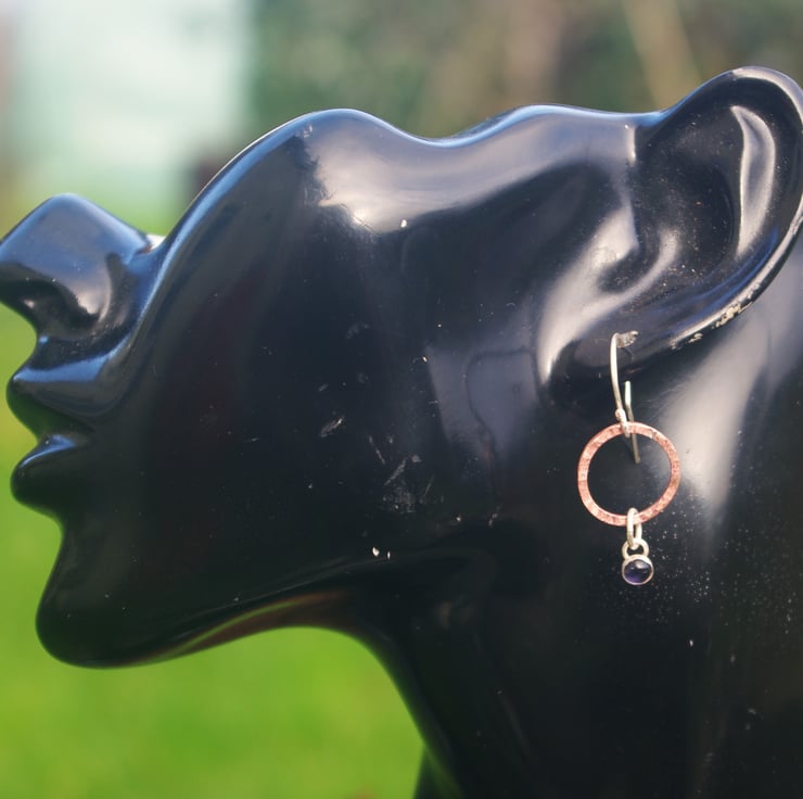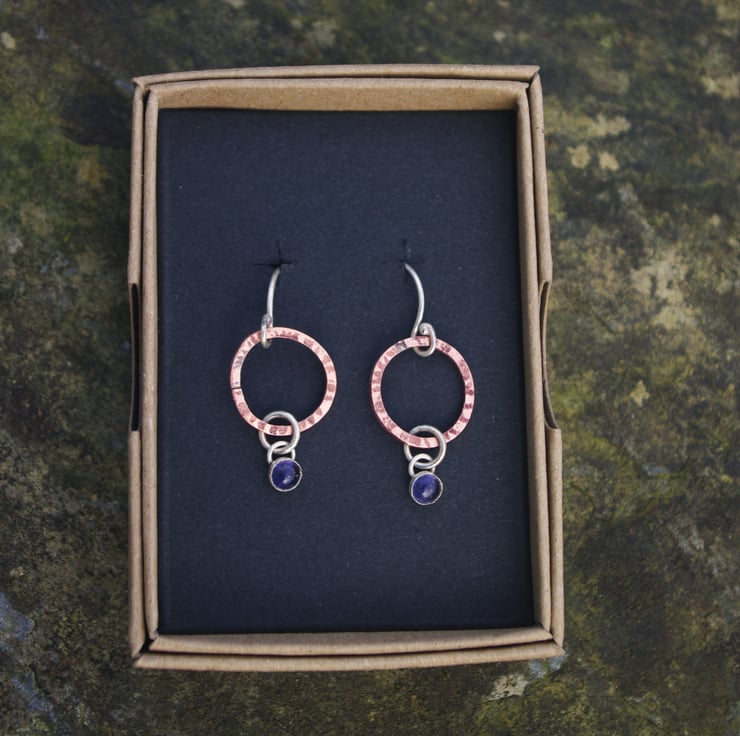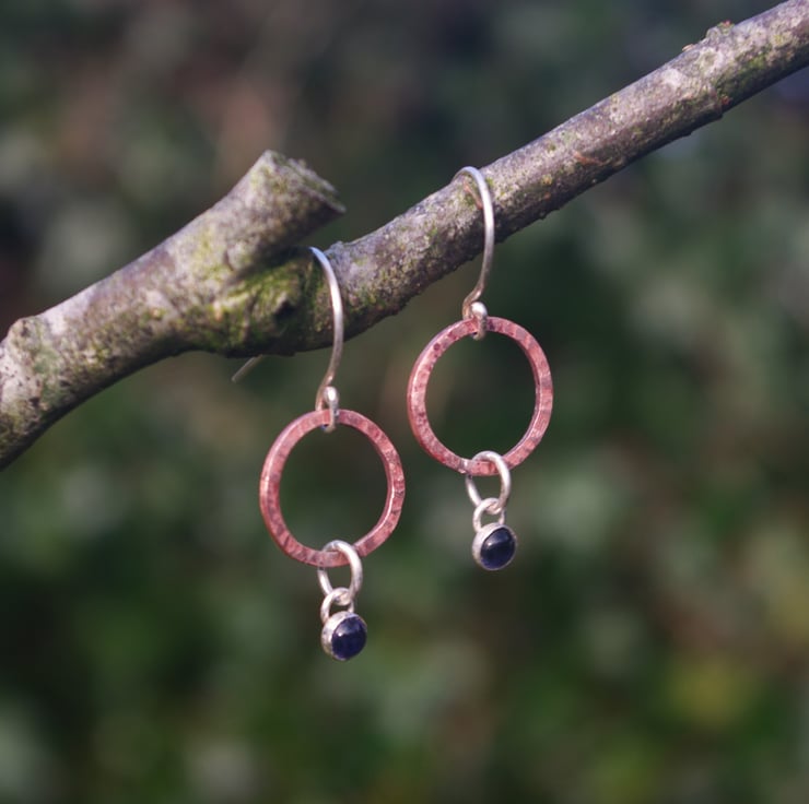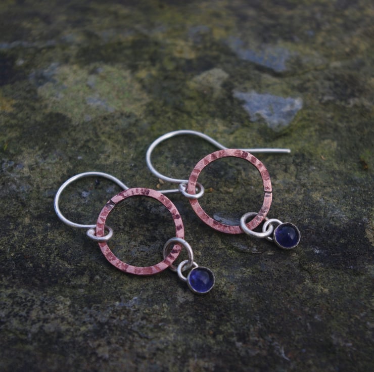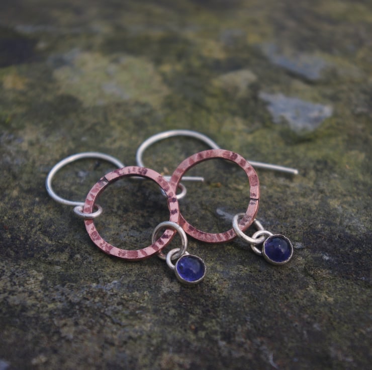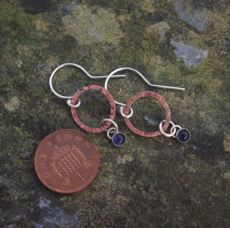 Copper roughly circular earrings inspired by natural textures. They are made with square wire, textured with a small hammer. Th deeper copper shades are achieved with heat and are preserved with penetrating wax. Violet/blue Iolite cabochons with a diameter of 4mm, hand set in silver, dangle from the bottom, moving about freely. .