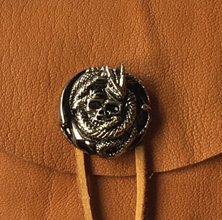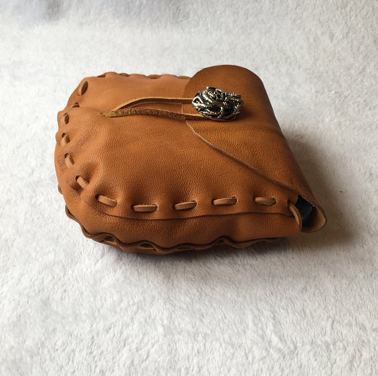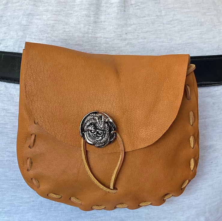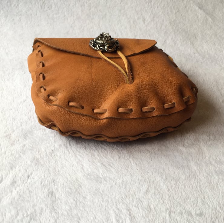Rustic Brown Tan Coloured Leather Medieval Style Pouch - Dragon & Skull Closure
