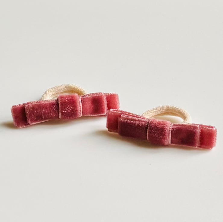 Handmade vintage Rose Pink Velvet ribbon envelope Bows, set on mini nude soft bands for a comfortable hold.
