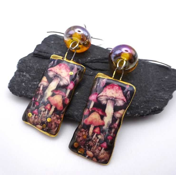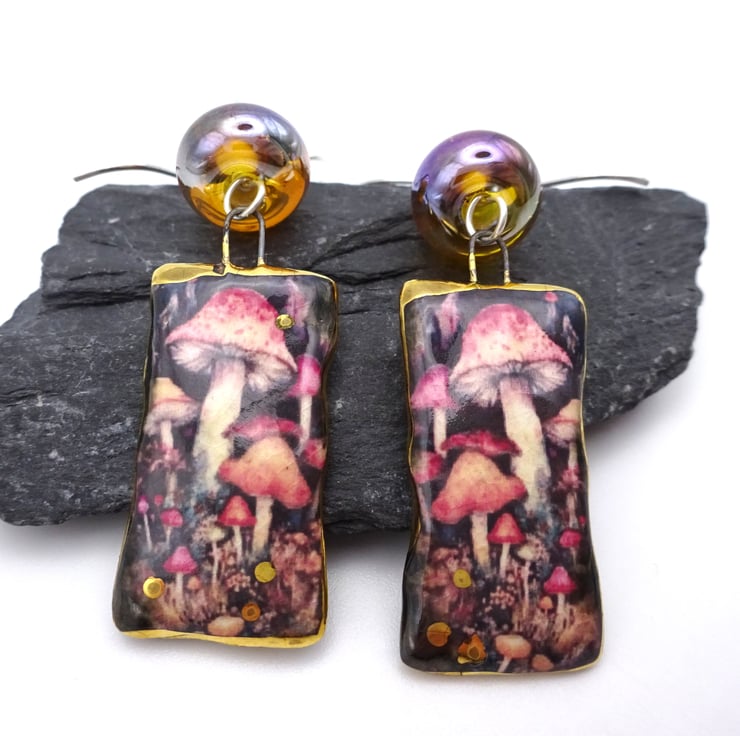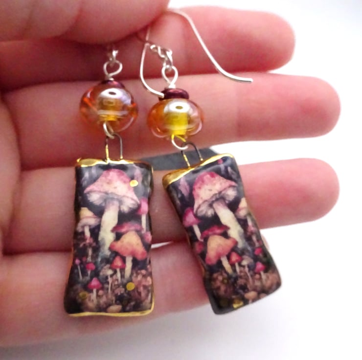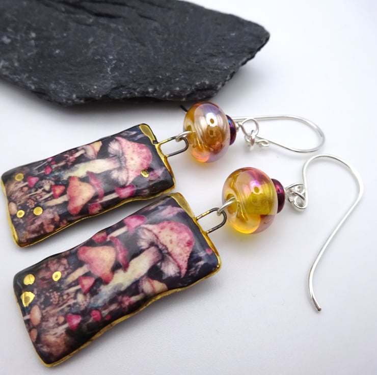A pair of earrings made with handmade sterling silver ear wires, handmade gold lampwork glass beads and handmade ceramic toadstool charms.