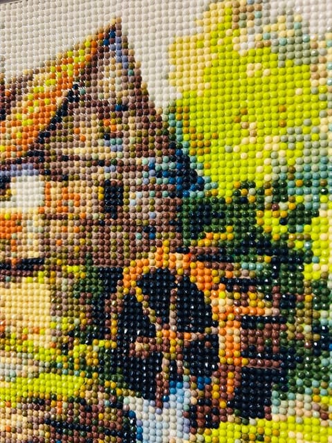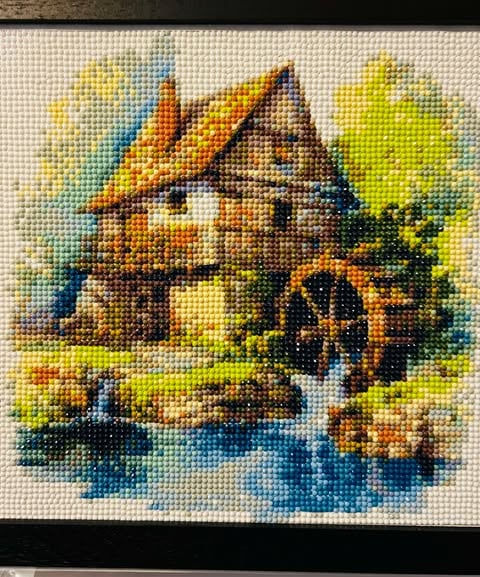 I worked on this amazing Diamond Art Painting ” Mill by the River” for up to 30 hours. There are 9.375 gems in this picture which are manually placed, one by one with care and meticulousness. Finished, brushed, and sealed to guarantee stability and shine, to avoid gemstones falling out, also.