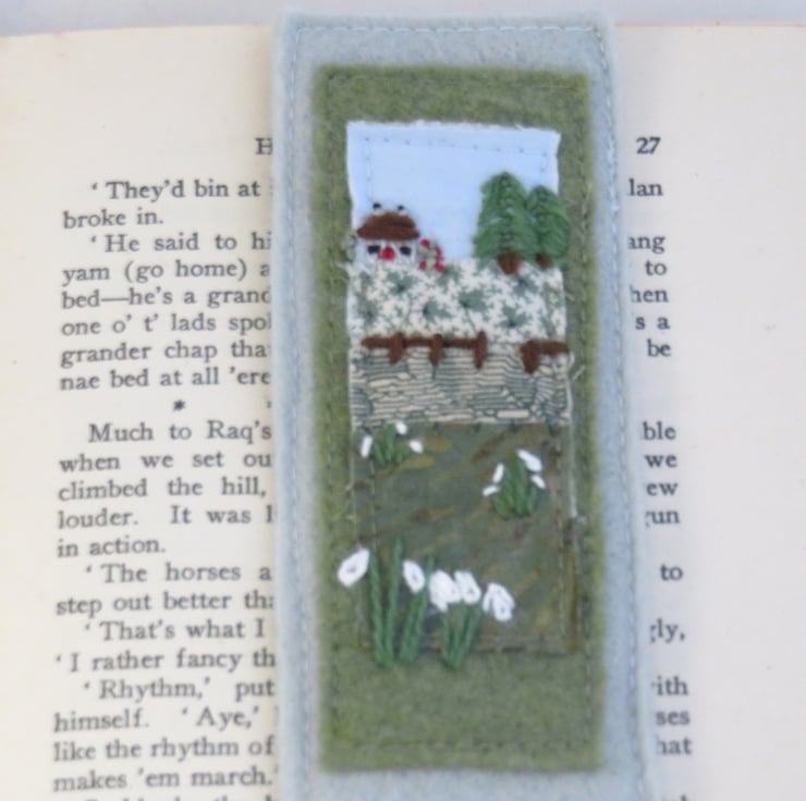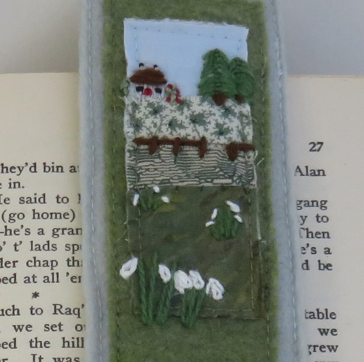 Snowdrops feature in the foreground of this hand embroidered felt bookmark.
