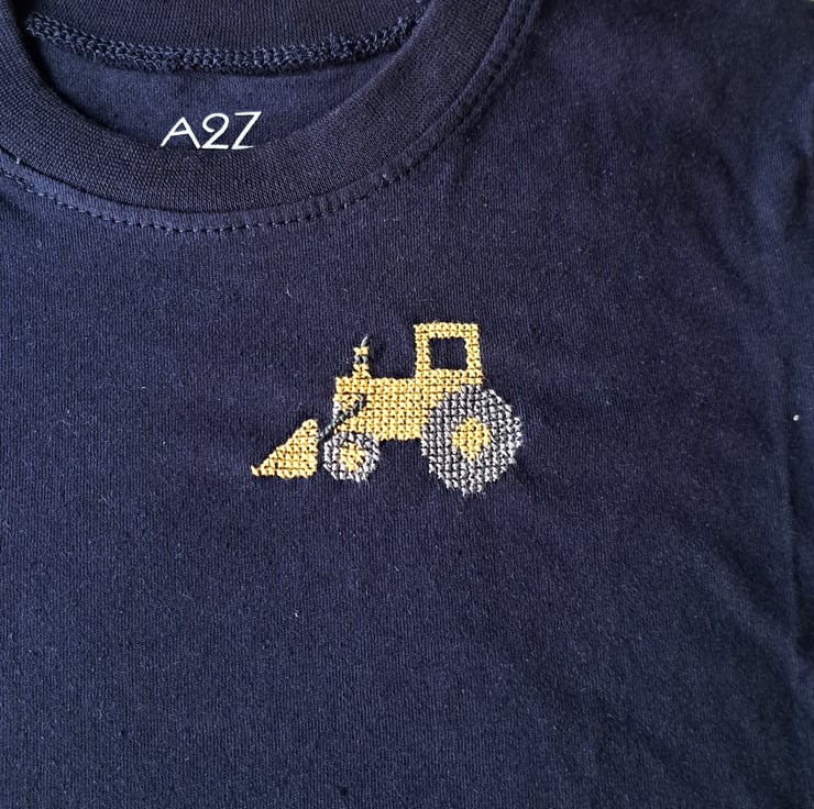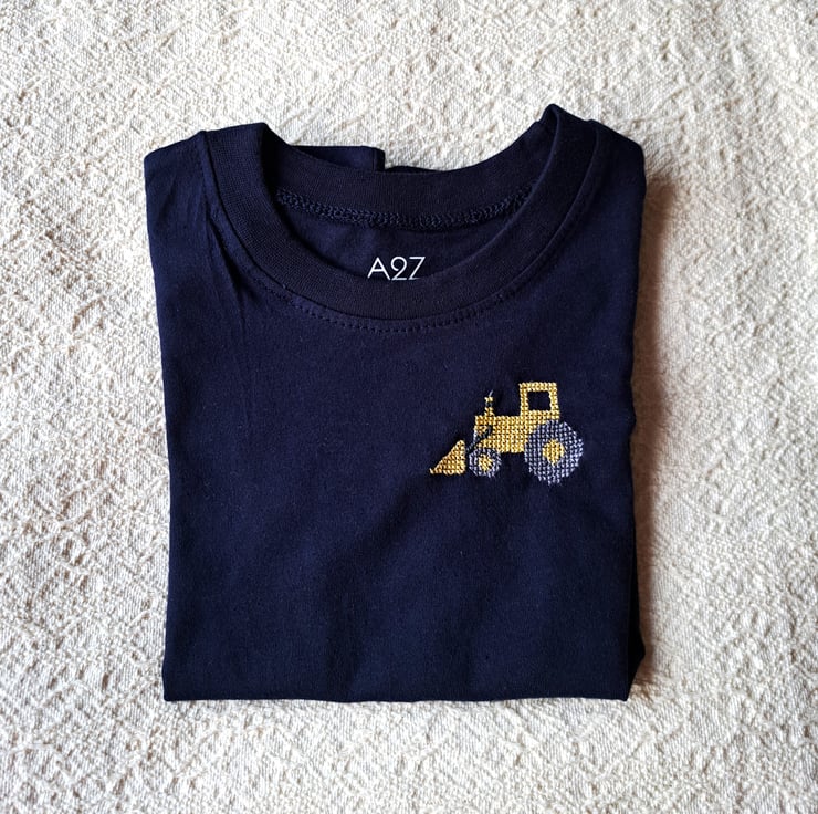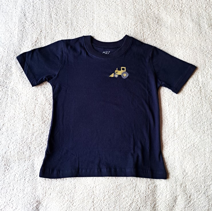 I have hand stitched a yellow digger on the left front of this dark navy T-shirt age 5-6 years. As I never use a permanent backing material when hand embroidering kids' clothing, there is nothing inside to irritate your child's skin. The shirt has a round neck and short sleeves. It is all cotton, and can be machine washed.