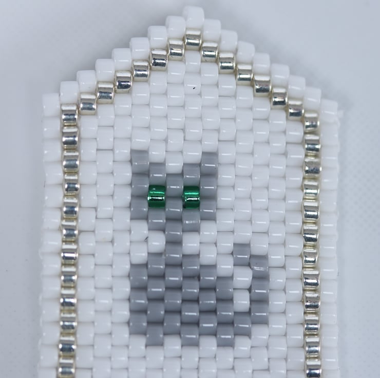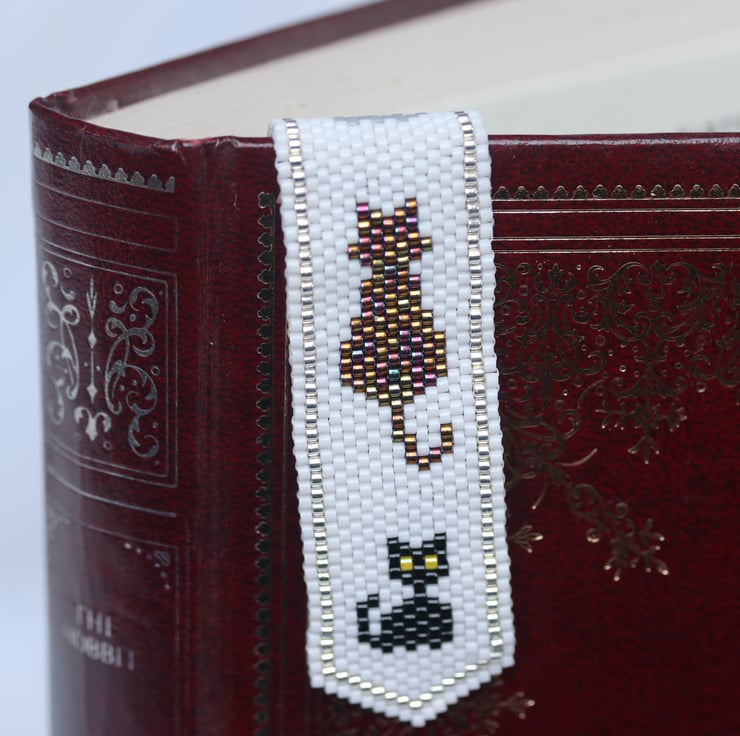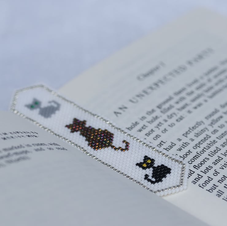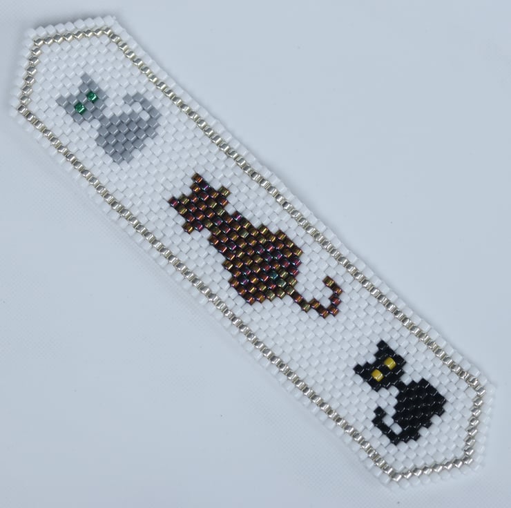 The bookmark is beadwoven, made from glass delica seed beads which have been stitched together. The pattern is double sided so that it looks the same on both sides. The design is my own: a ‘tortie’ (bronze beads) cat with its back to you, and two cheeky little kittens, one grey and one black on a white background with a silver border. I have not stiffened the beadwork at all, so the bookmark is fairly flexible.