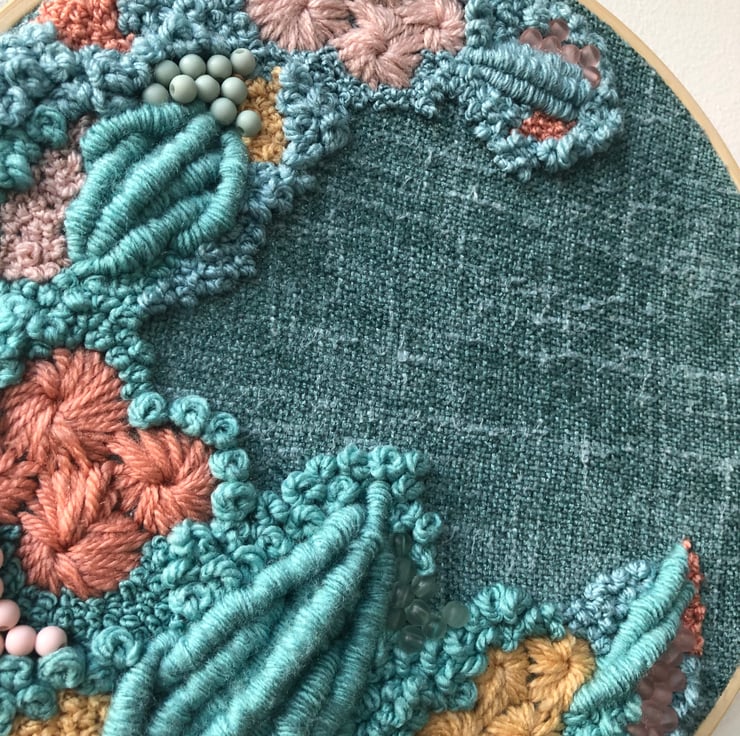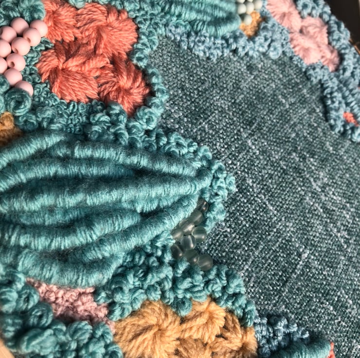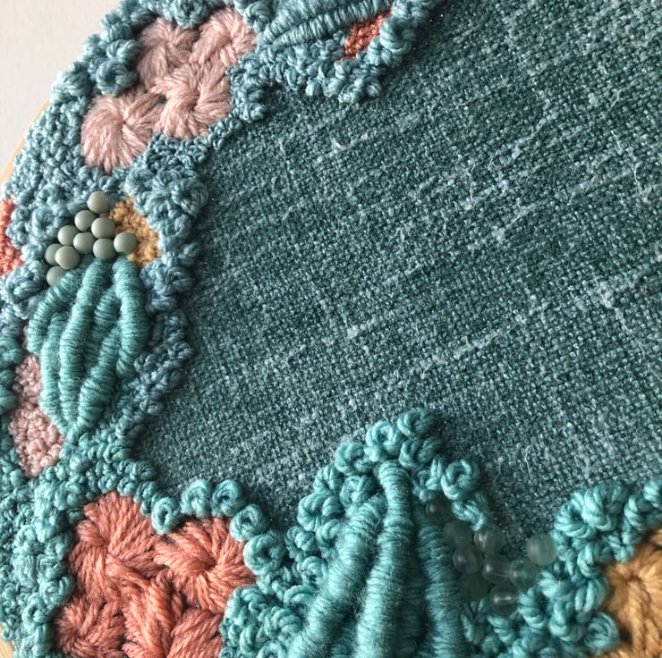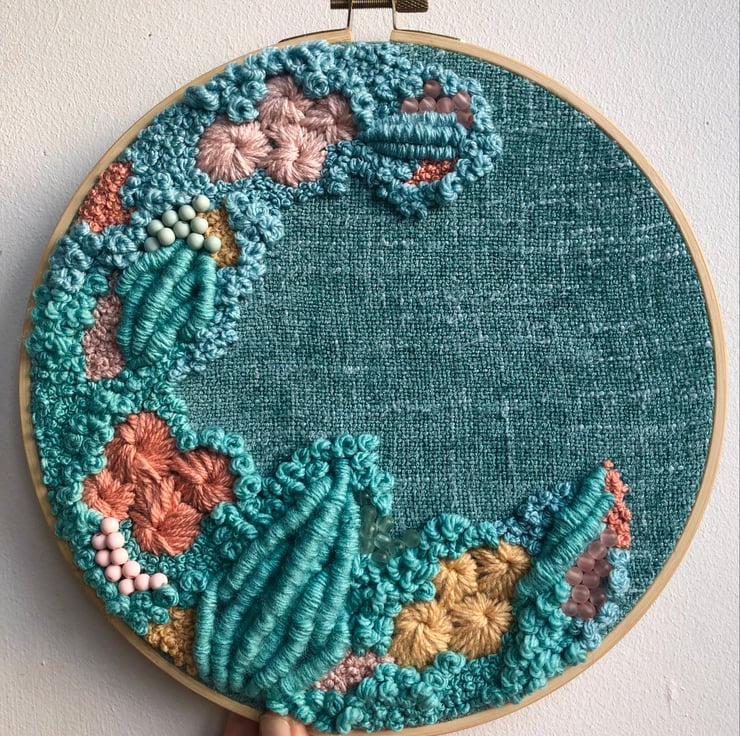 Spring thinking a 9 inch one of a kind art piece. Embroidery thread, yarn and beads have been hand stitched in an abstract pattern onto a teal blue fabric. This has created a piece of art which is both eye catching and unique. A perfect addition to any home.