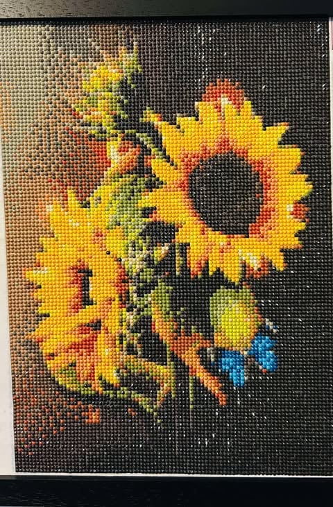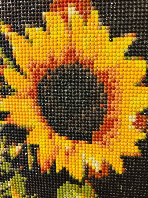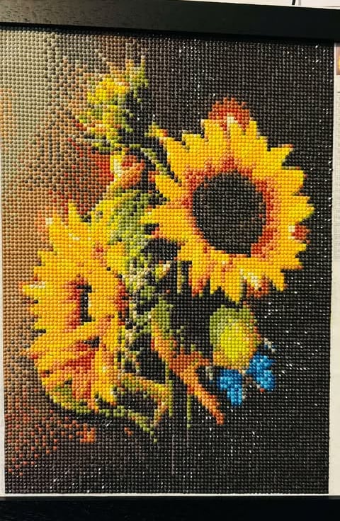 Worked on this Diamond Art Painting ” Sunflower and Butterfly ” for up to 40 hours. There are 14.000 gems in this picture which are manually placed, one by one with care and meticulousness. Finished, brushed, and sealed for stability and shine, to avoid gemstones falling out.