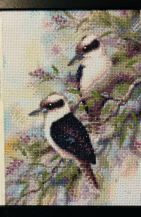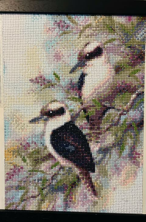 Worked on this Diamond Art Painting ” Two Birds” for up to 40 hours. There are 14.000 gems in this picture which are manually placed, one by one with care and meticulousness. Finished, brushed, and sealed for stability and shine, to avoid gemstones falling out.