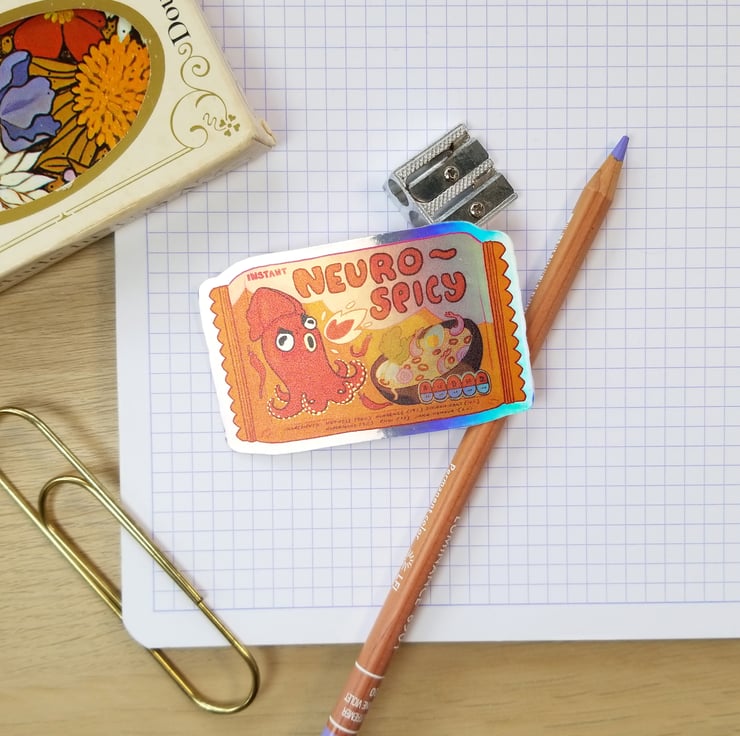 This spicy sticker is printed on waterproof holographic vinyl, which gives it a beautiful metallic glow. Slap it on your laptop, Kindle, water bottle, your ADHD friend's forehead, wherever you like!
