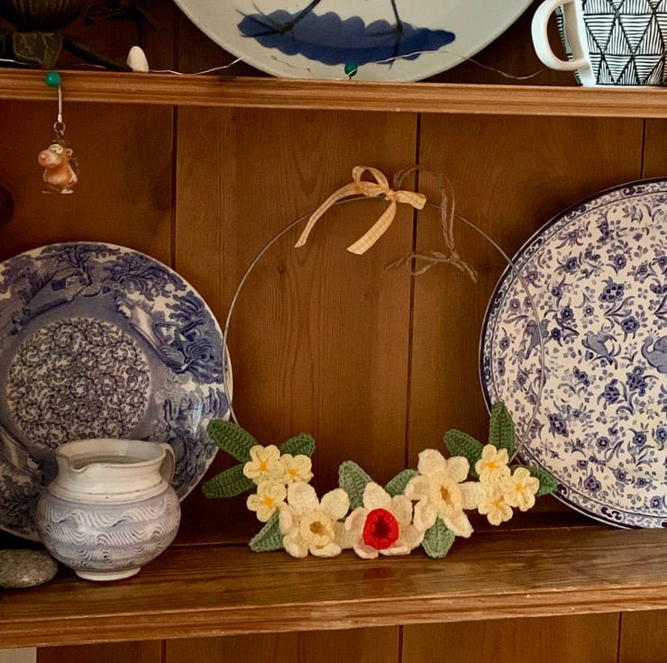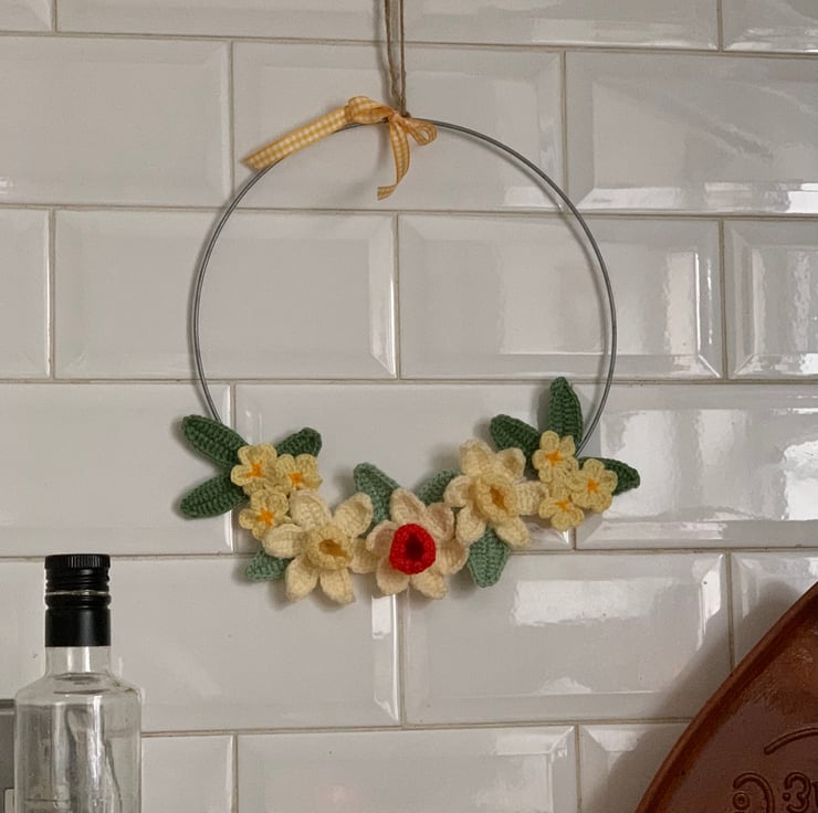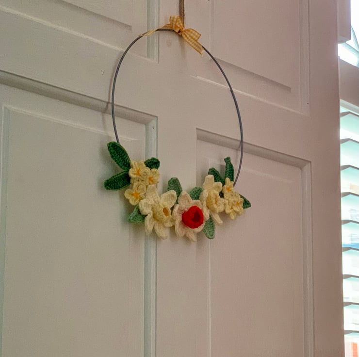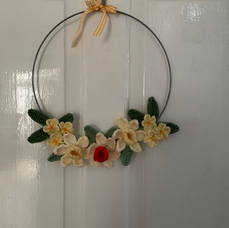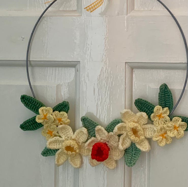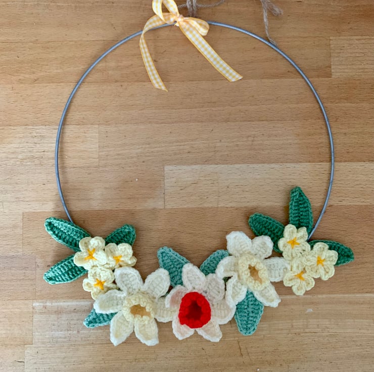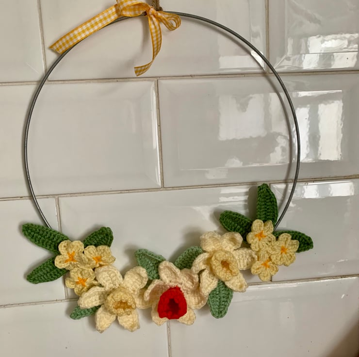 Crochet daffodil and primrose wreath. This wreath consists of 3 crochet daffodils and 2 bunches of crochet primroses on a silver wire wreath