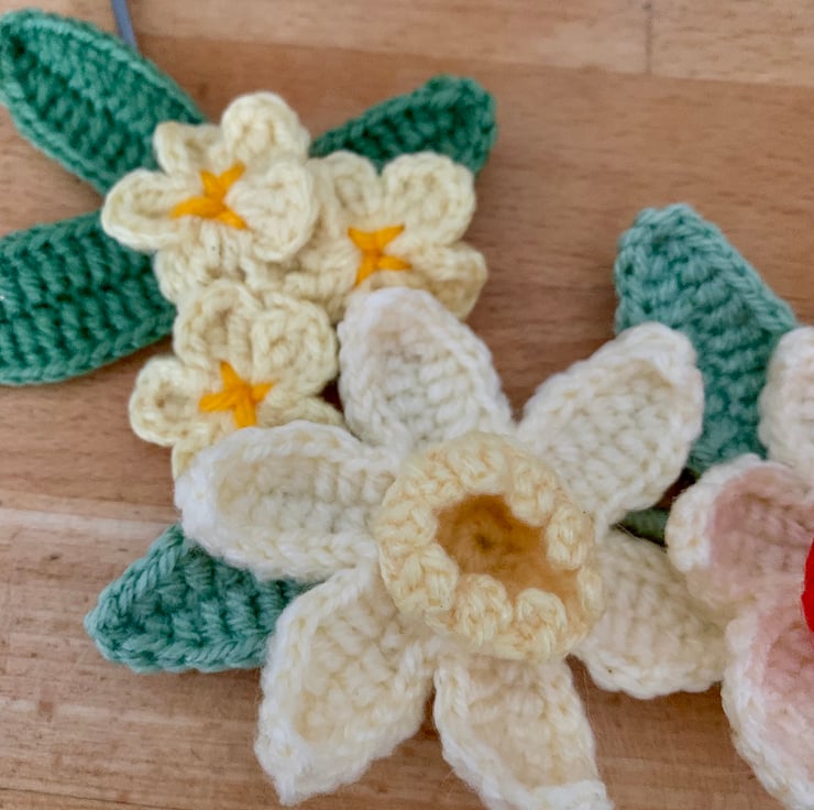All flowers are crocheted using acrylic yarn. The leaves are supported with florist wire.