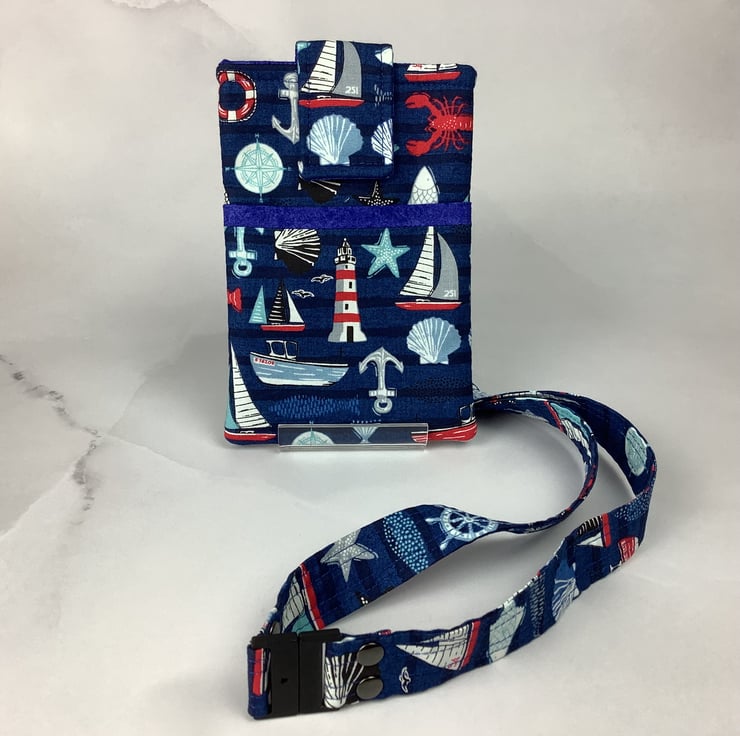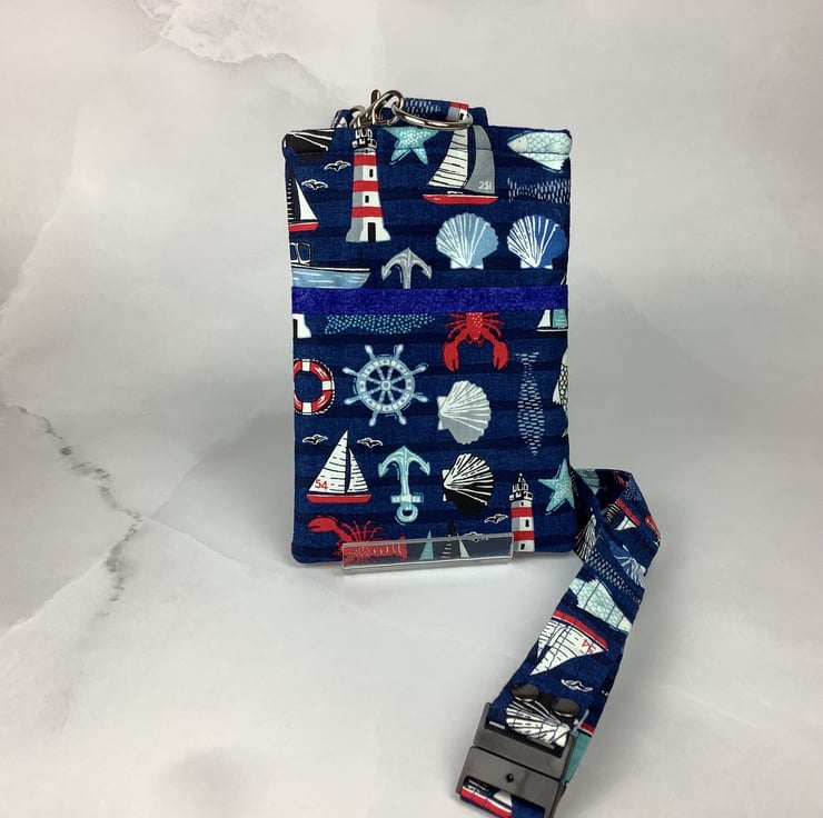 Handmade bag with a removable matching lanyard strap in fun choice of seaside themed cotton fabrics lined in complimentary cottons.