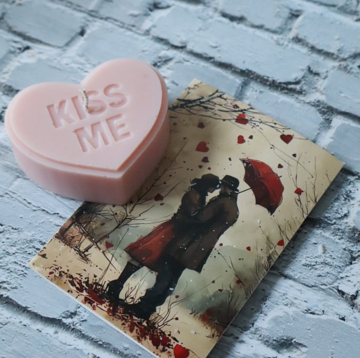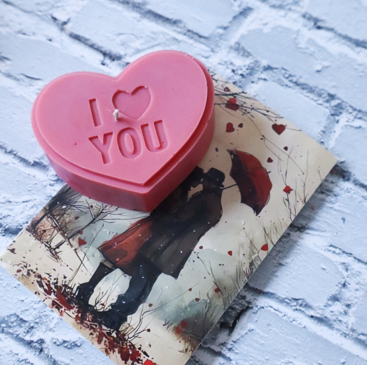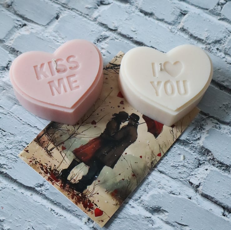 This set includes two heart-shaped candles: one inscribed with the message "I Love You" and the other with "Kiss Me."