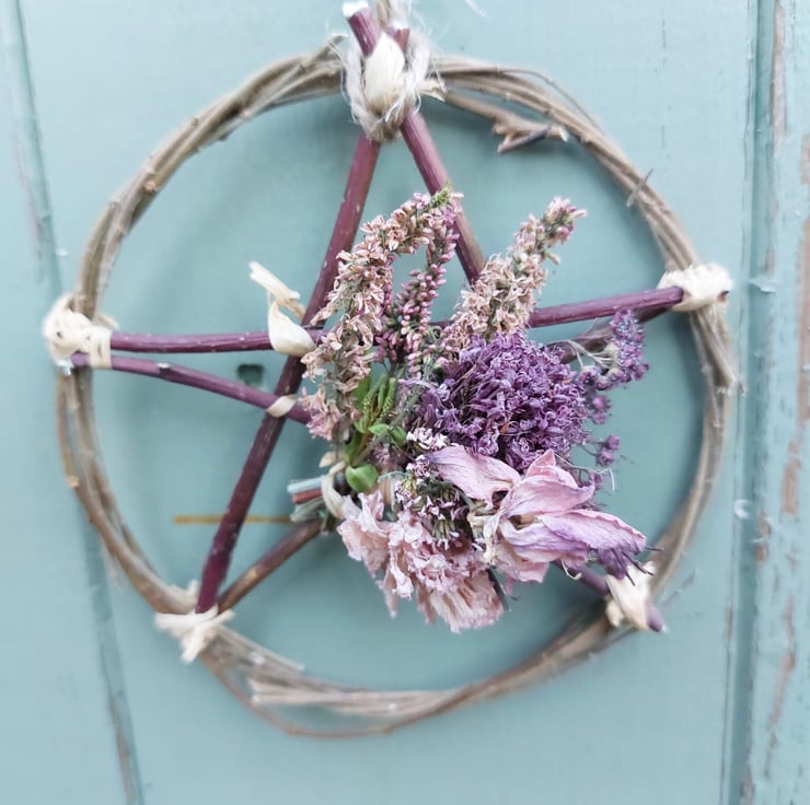 A handmade dried flower pentagram measuring approximately 10cm in diameter.