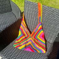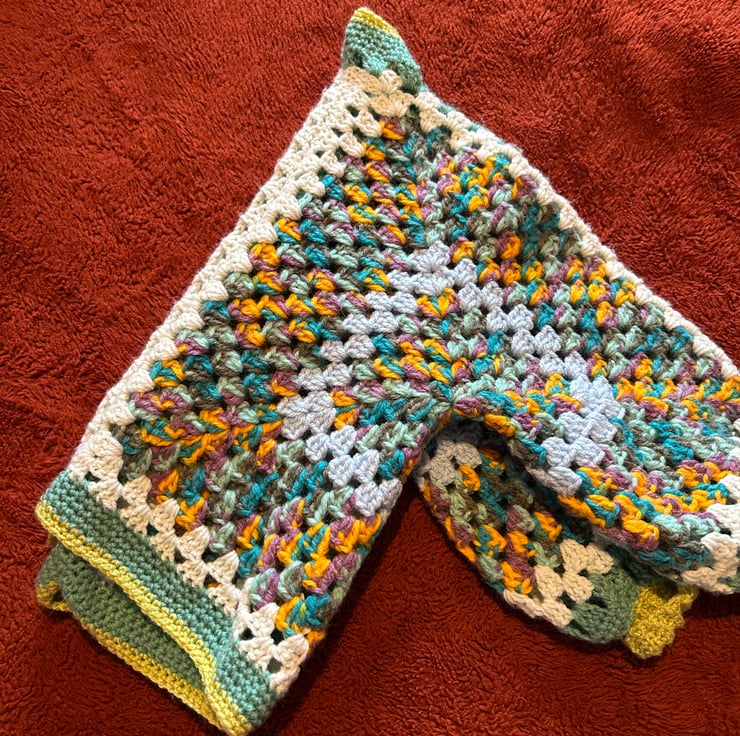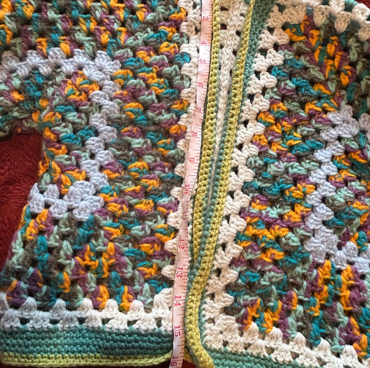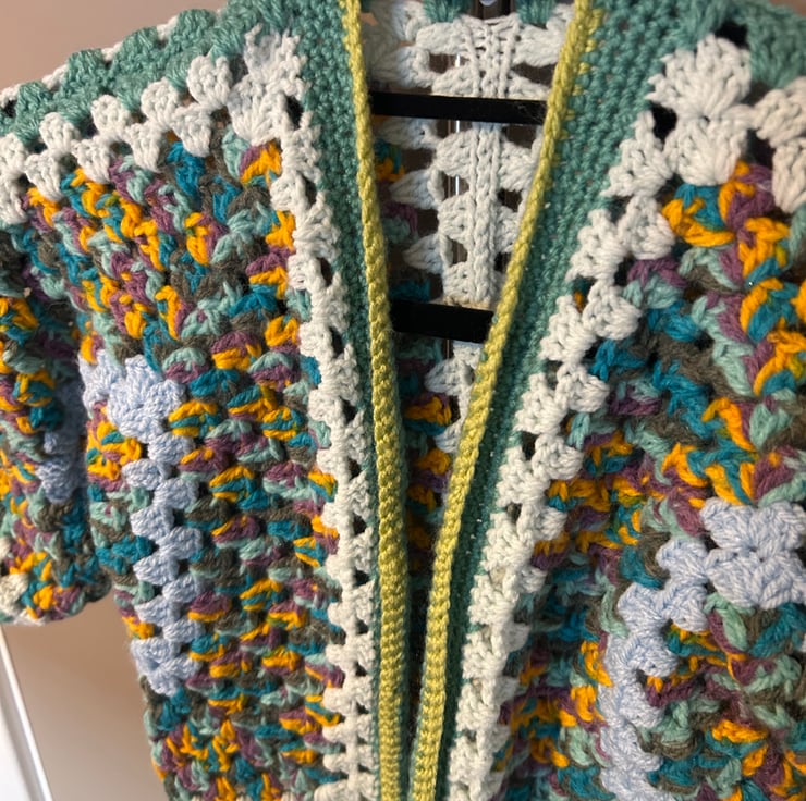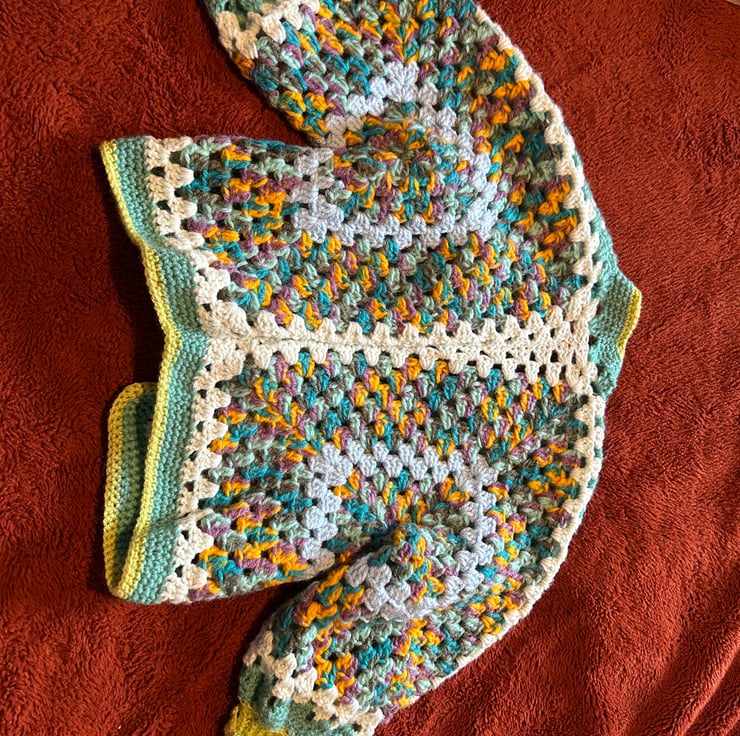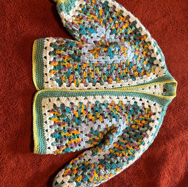 hand crocheted, unique one off design. Childs cardigan, to suit appropriately 3-4 years old. Really cosy and fun little cardigan, multi colour and soft and thick acrylic yarn.