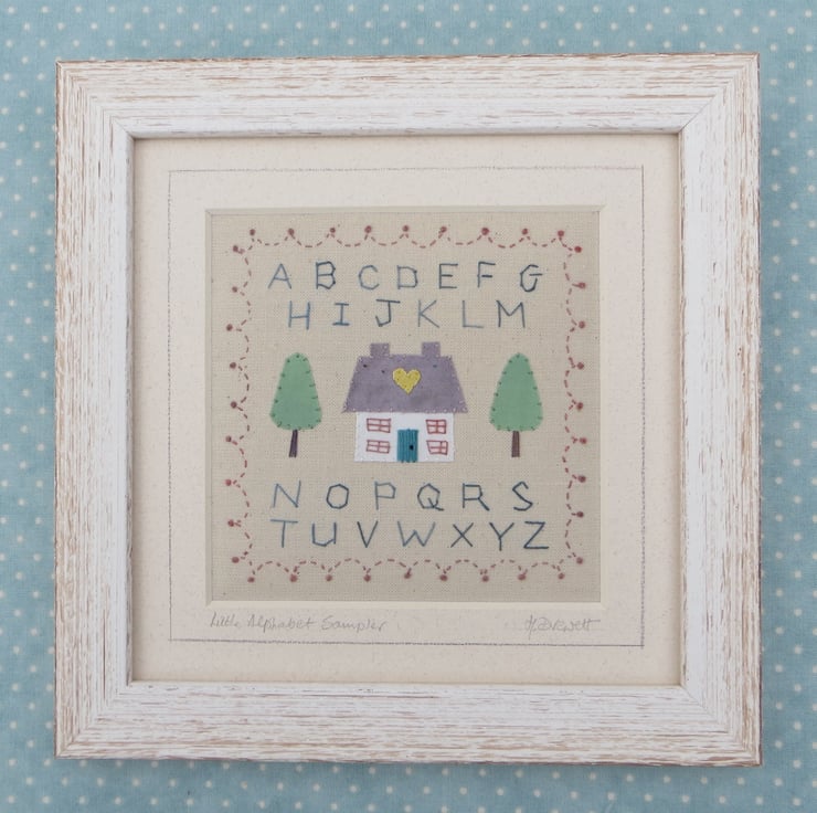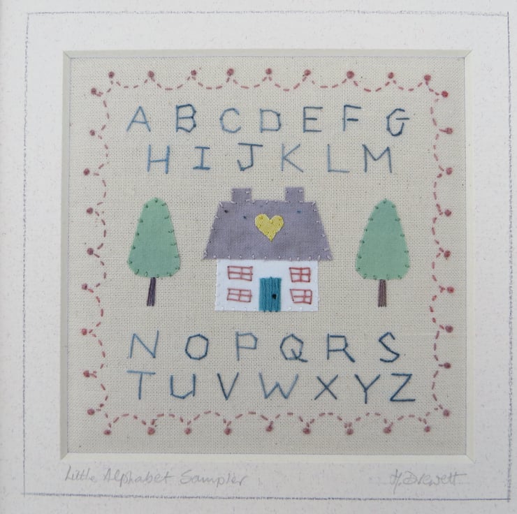 This little embroidery is inspired by samplers of old which often featured a house and alphabet letters. I have combined the elements to make a simple new piece, still with the homespun charm of times gone by. A lovely addition to any nursery!
