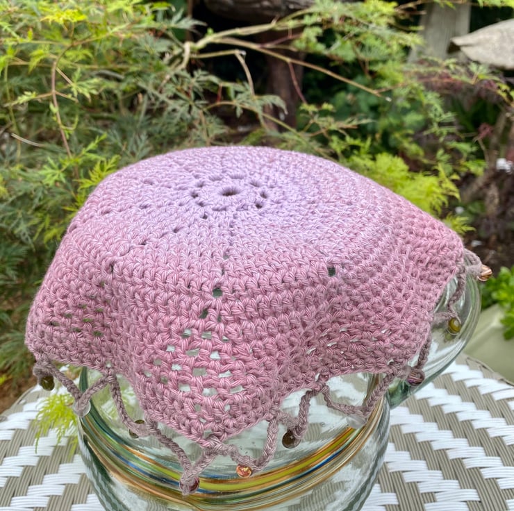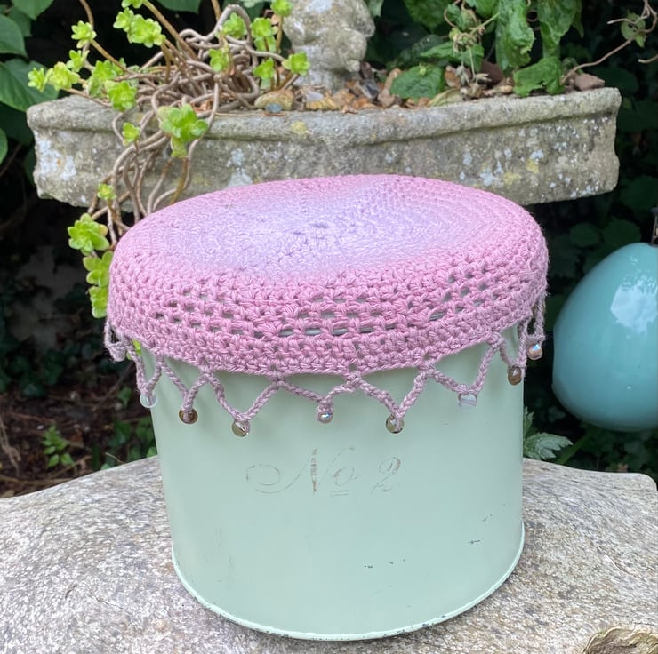 I discovered a small vintage crocheted jug cover at a local jumble sale and was so impressed I got my crochet hook out found some pretty variagating dusky pink cotton yarn and create my own design for this cover.