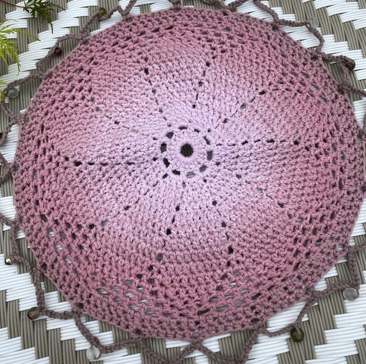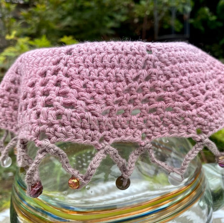A hand crocheted bowl or large jug cosy in a graduating dusky pink cotton yarn with added colourful glass beads.