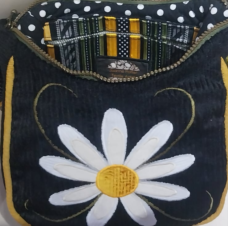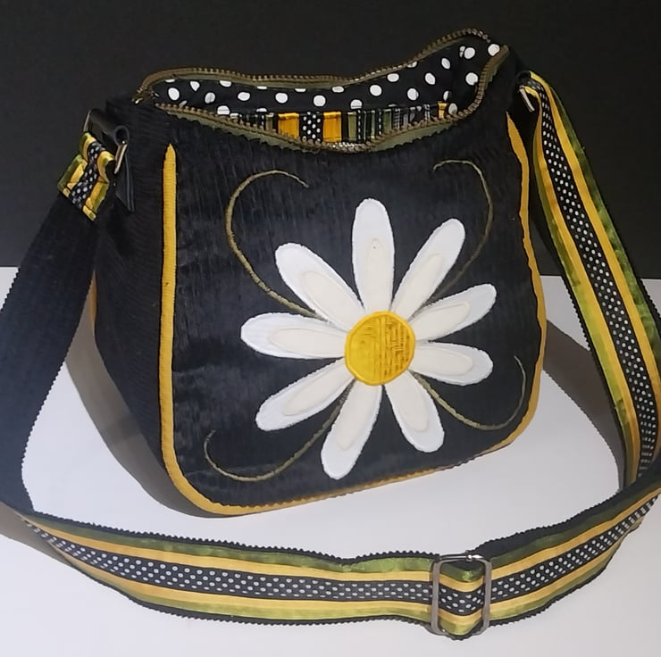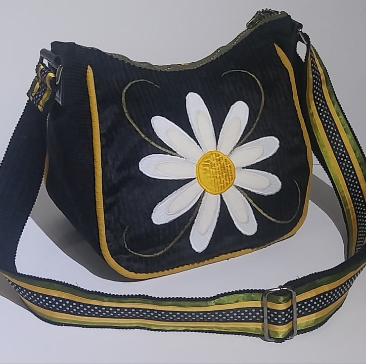 A chunky black corduroy features a simple white and yellow daisy, with petals made from a crisp white corduroy with a finer cream pin cord and a vintage sunny yellow center..