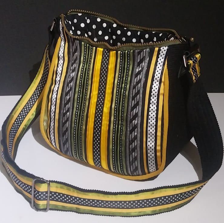 The bag fastens with a moss green zip, when open reveals a black and white cotton quilted lining, with an inside pocket (that matches the back) with makers label.