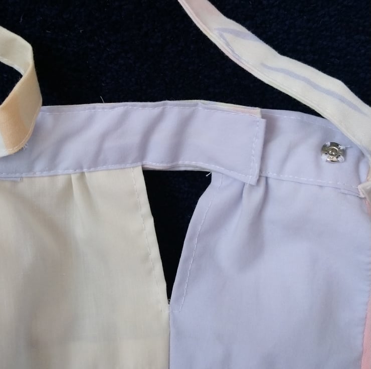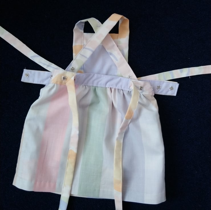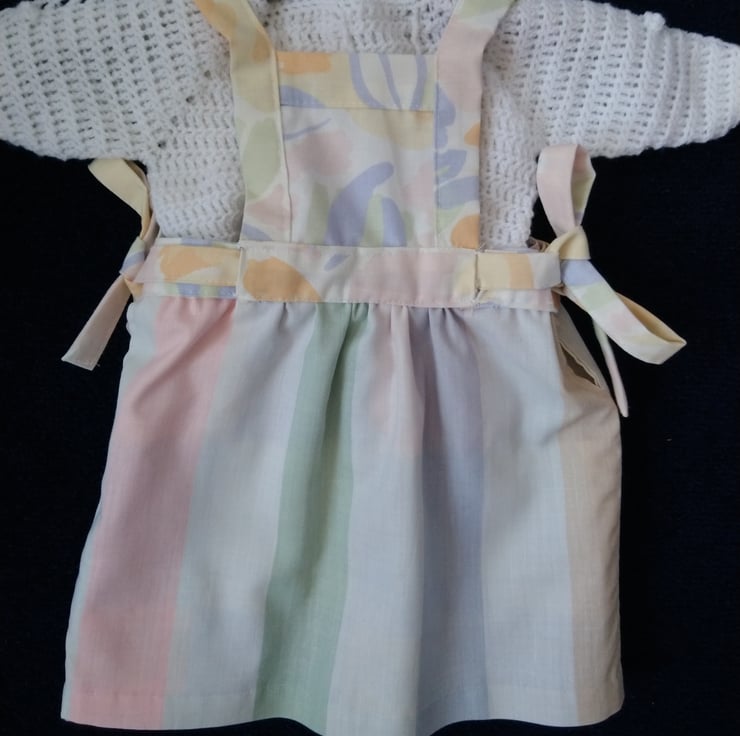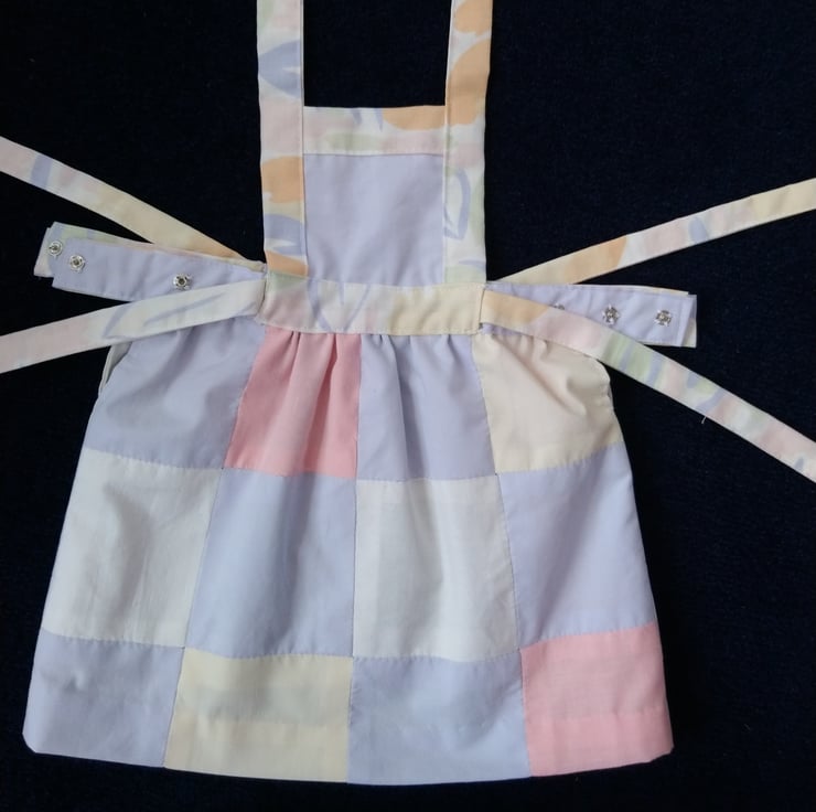 A unique baby dress. It is reversible, so if you are out somewhere special and it gets soiled, you can just turn it inside out, rethread the ties, and it looks perfect again. Made in handsewn patchwork using pretty pastel fabrics, including a Laura Ashley print and squares in plain pastel cottons. It also features a waistband and straps with poppers in different positions, to allow for baby's growth.