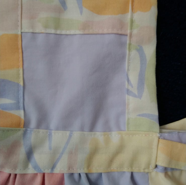 One side of the dress has the skirt in patchwork squares of lilac, pink, white and cream, with the bib in plain lilac and the straps and edging in the Laura Ashley material. The other side of the dress has the skirt in a pastel striped fabric and the bib in the Laura Ashley material.