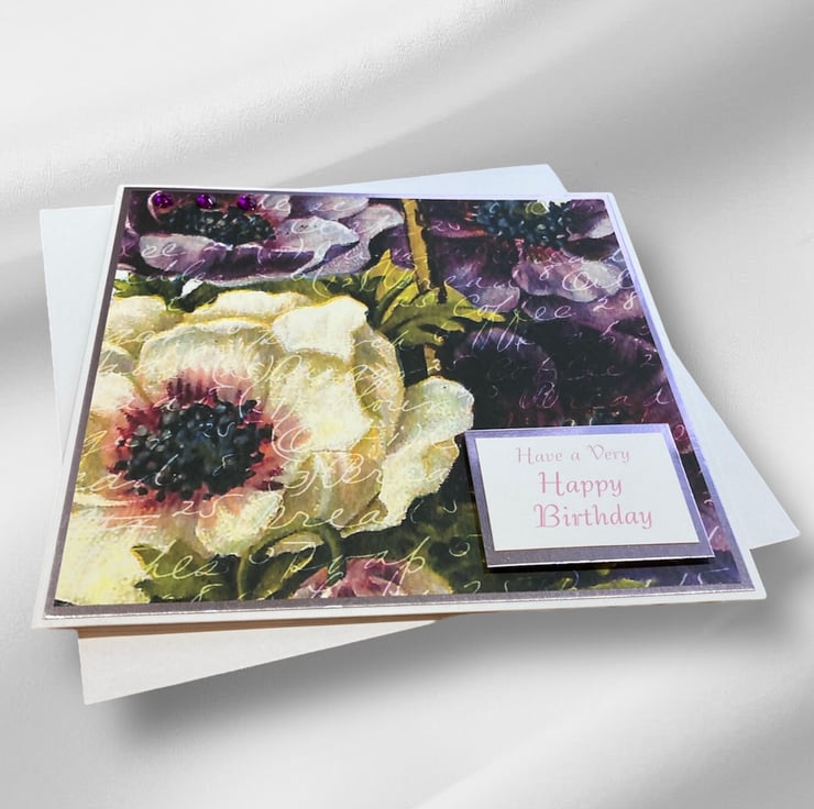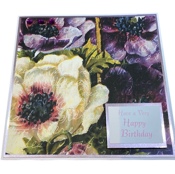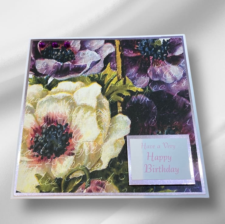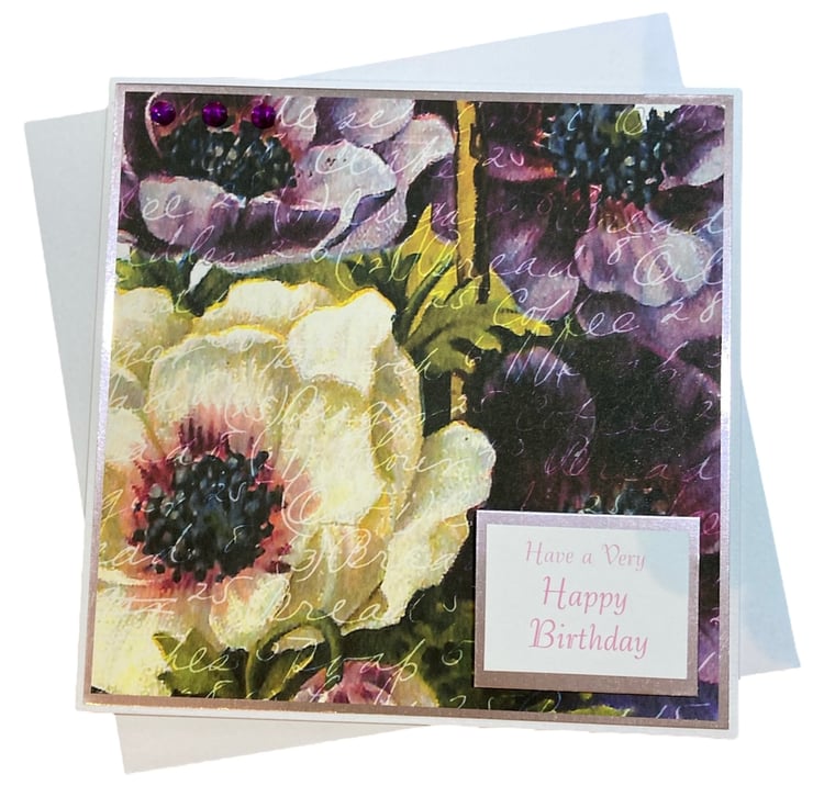 This pretty birthday card features hellebores in bursts of purple and cream. The card is layered with pink card topped with the floral decorated paper. The words Have a Very Happy Birthday have been added.