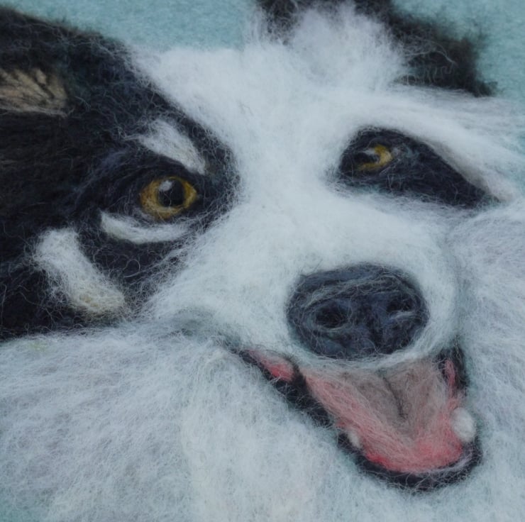 Handmade needle felted realistic Border collie portrait, made from natural and dyed felting wool, on a soft green heathered felt background. This portrait is on a piece of felt measuring 10 x 12 inches making it a good portrait size. It comes unmounted and unframed, leaving it up to the buyer to choose a suitable frame.