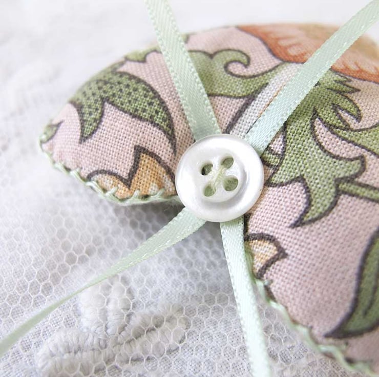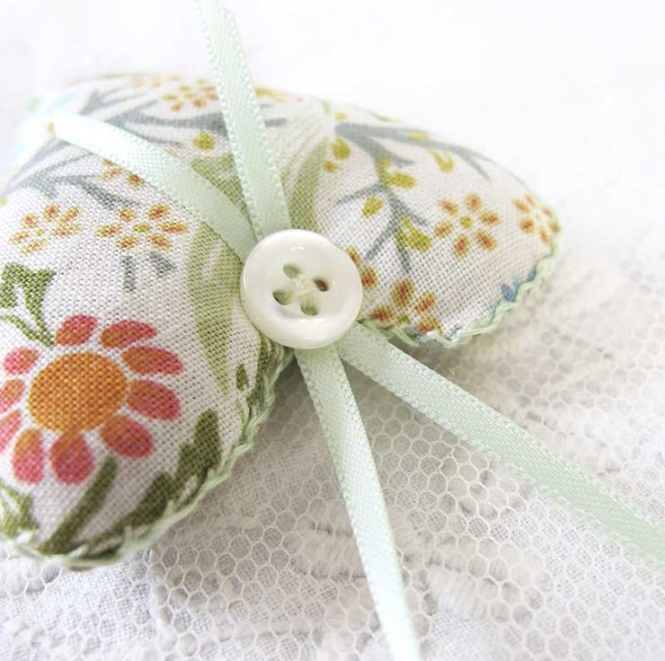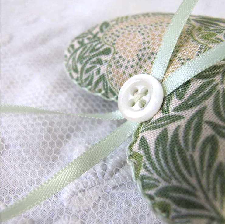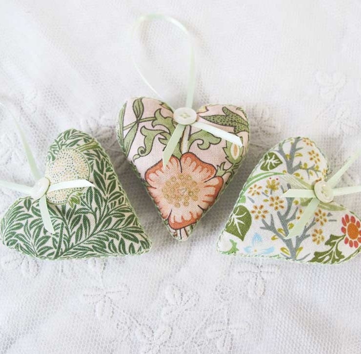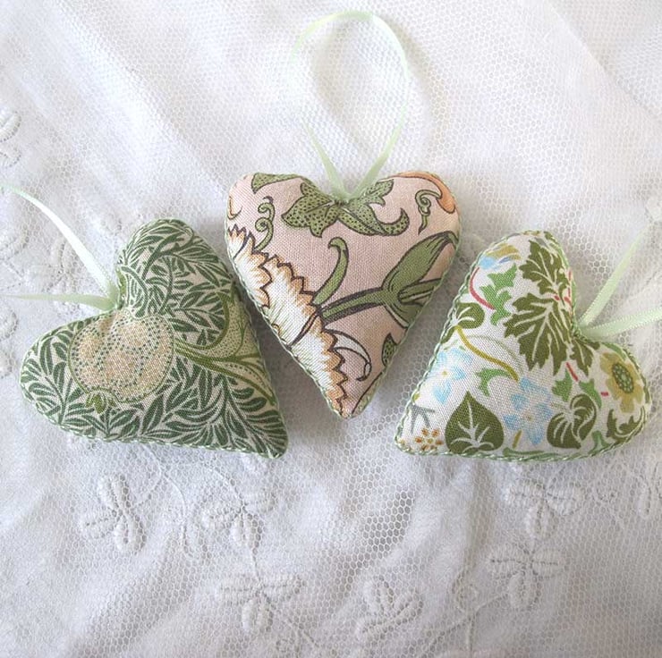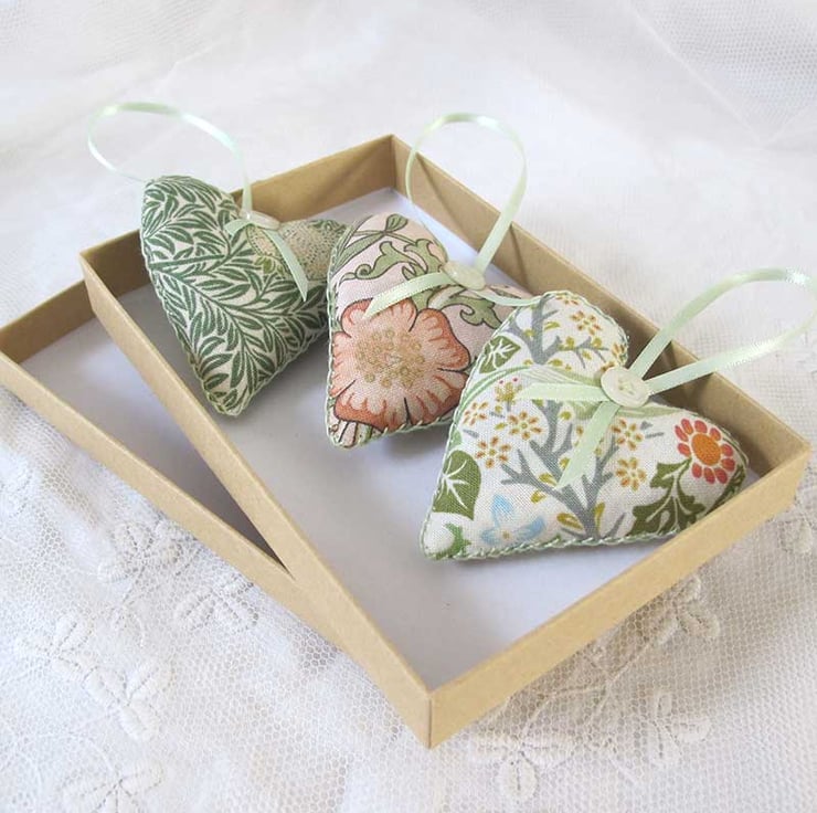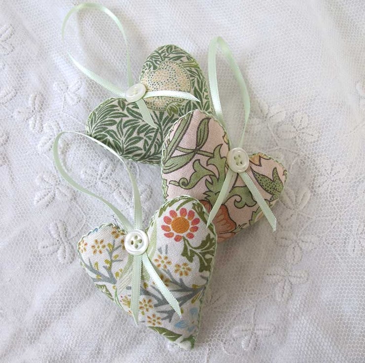 A very pretty little set of three lavender bags - hand made, filled with beautiful scented lavender and then finished with hand embroidery, satin ribbon and gorgeous little vintage pearlised buttons. They are in shades of green with pale pink and cream, and co-ordinating pale green ribbon. The hearts measure 6cm wide x 6.5cm long (not including the ribbon) and are made in William Morris designed fabric.