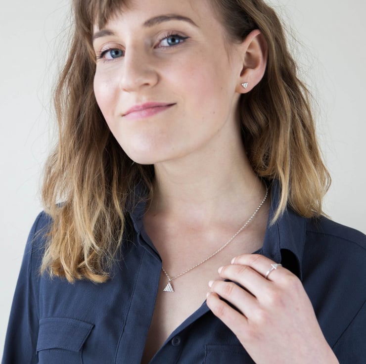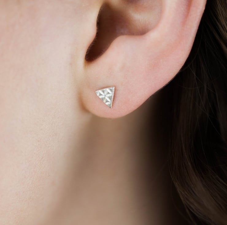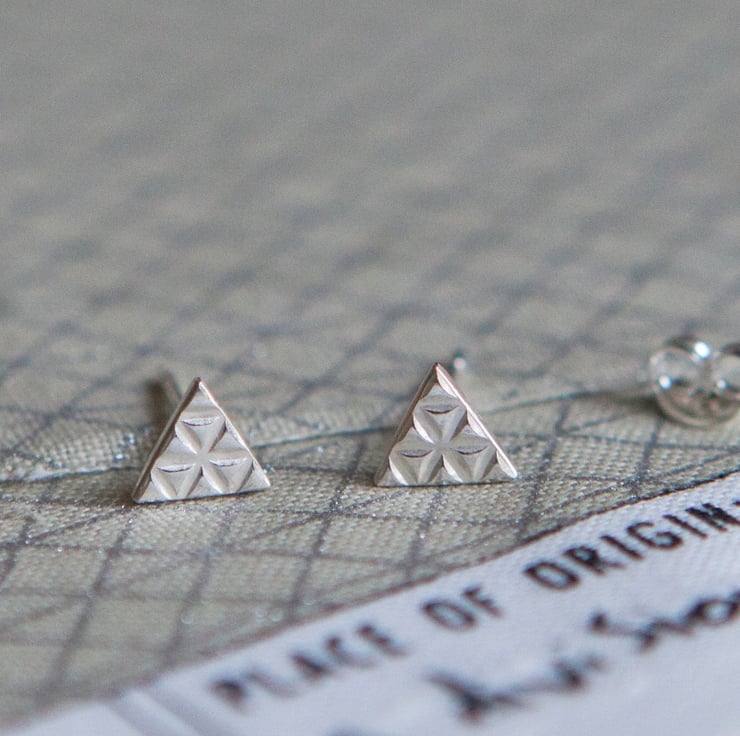 These minimal geometric earrings are handmade from 100% recycled sterling silver so an eco friendly gift for Christmas for an eager globetrotter. These small triangle earrings have been hand cut in sterling silver and textured to evoke hieroglyphs from the Americas.