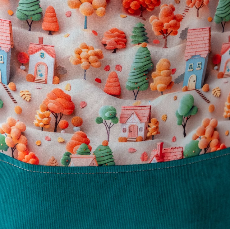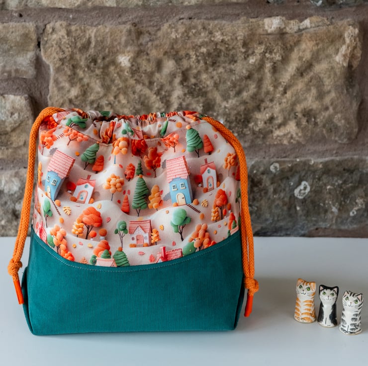 I've used a cute and colourful 3D print of Little Houses set in a treescape and a tactile green needlecord for the outer of the bag. These are lined with woven cotton and have an additional fleece layer added for soft squishness and structure. The inside of the bag is lined in a toning warm tangerine coloured cotton (also lined with woven cotton) and has a yarn guide with a popper closure on the side.