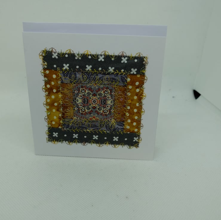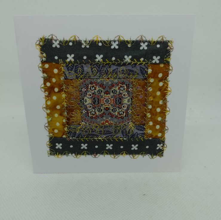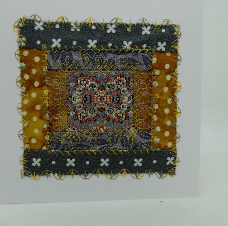 I am using up a range of unused quilt blocks, unfinished embroideries and various bits of ribbon and fabric to make a range of greetings cards.