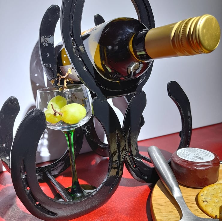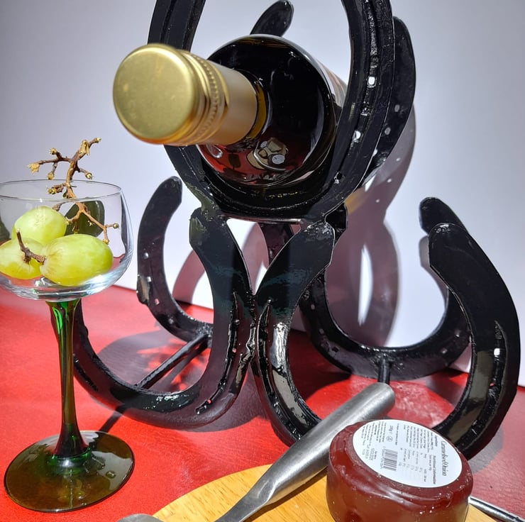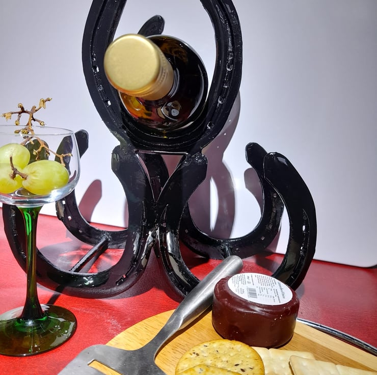 Display your love for all things equestrian with this stunning horse shoe wine bottle rack. Handmade this vintage inspired wine rack is made of steel and can hold up to three wine bottles at a time. The black colour and country style make it an eye catching and unique addition to any wine collection. The rack is assembled making it ready for immediate use, please note all my wine racks are handmade using recycled materials and may contain small imperfections. You will not be receiving any food, wine or wine glass with this item just a well made quality wine rack, thanks for looking. I will only ship to the UK.